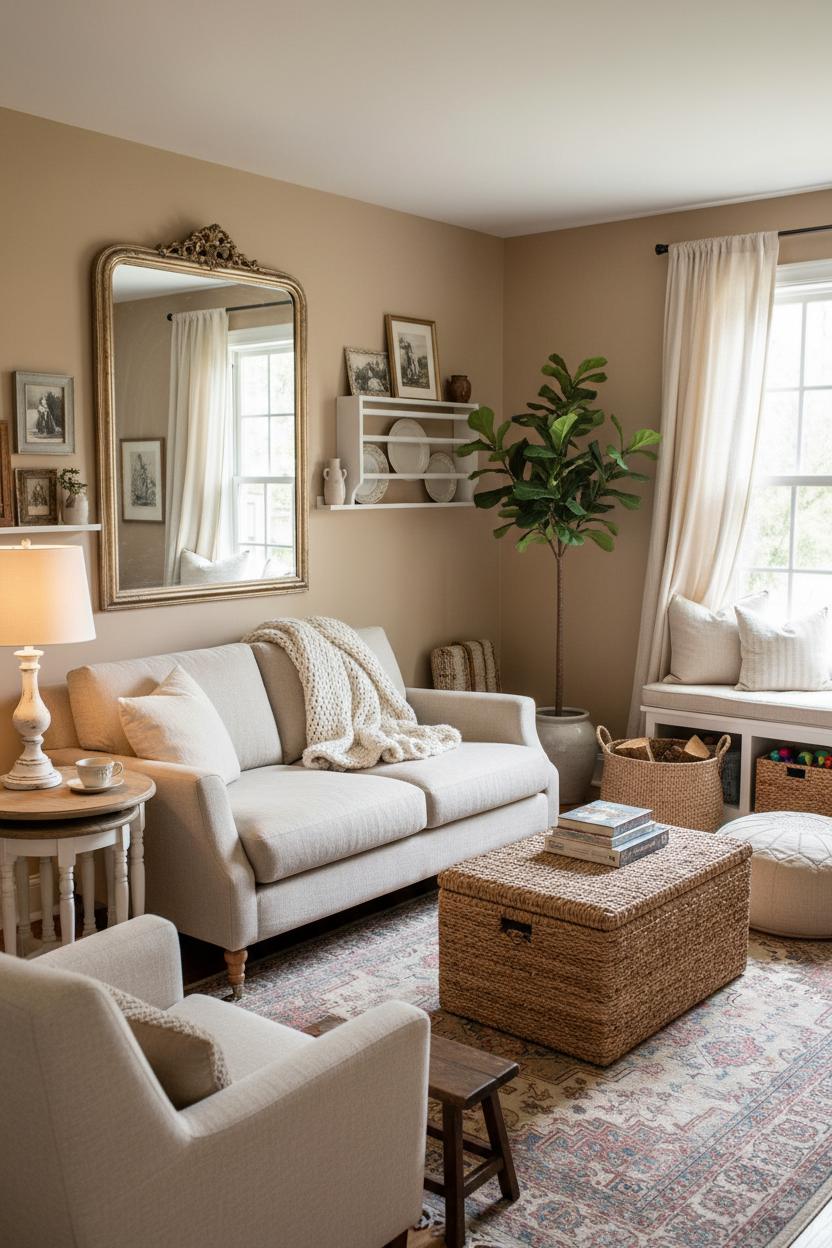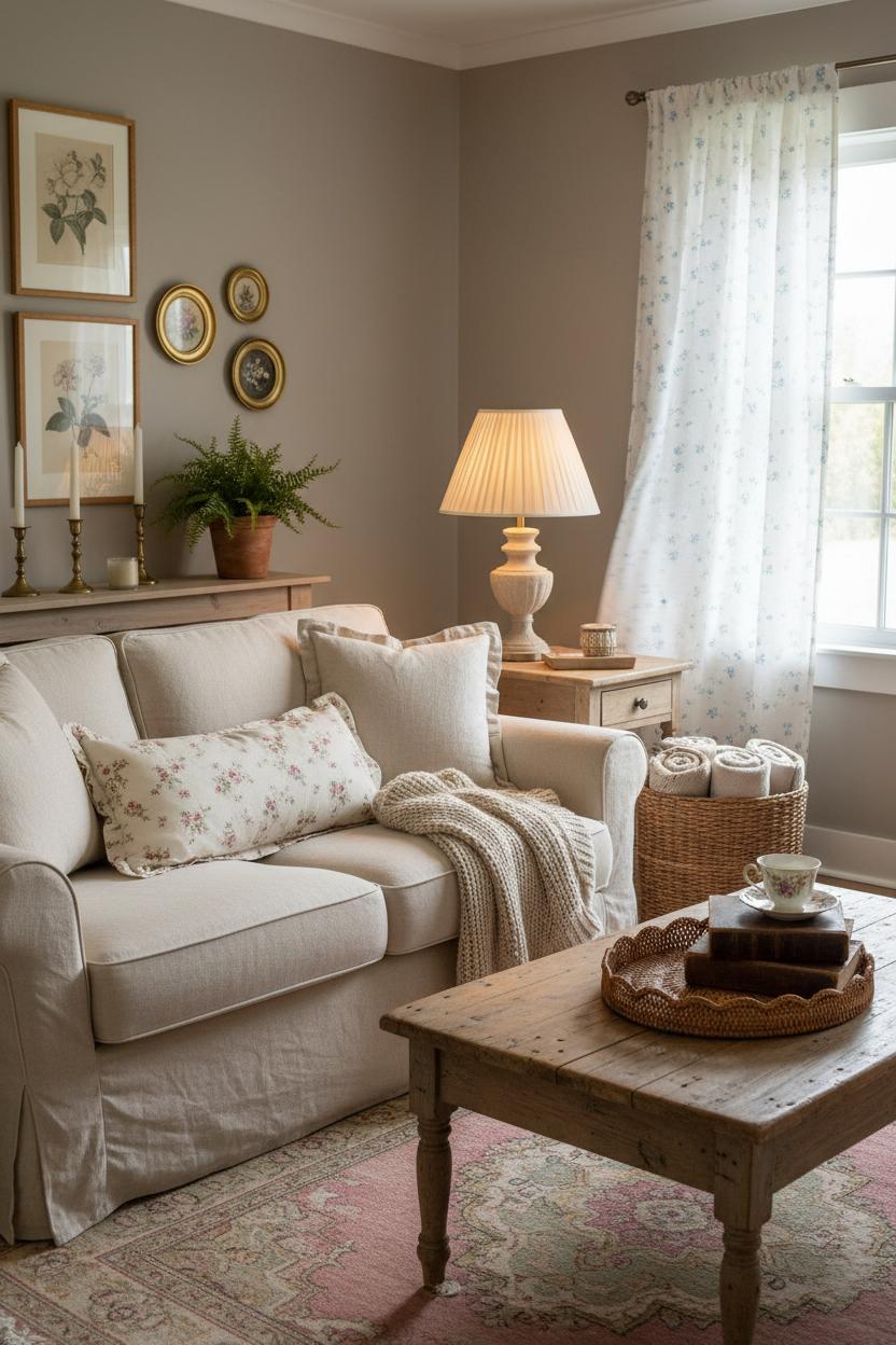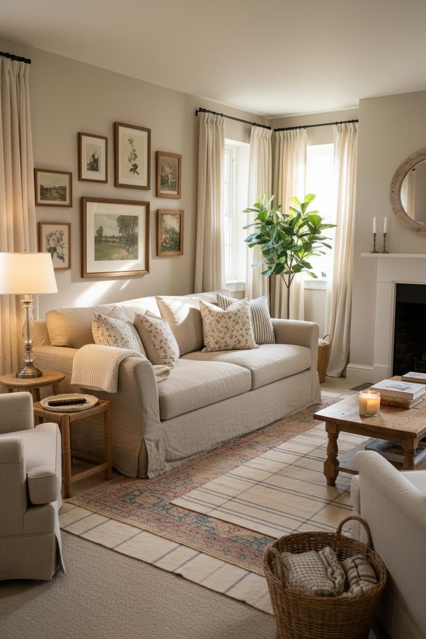 When you’re working with a petite footprint, the smartest small living room ideas start with light. Treat your windows kindly with airy, unlined curtains and keep the palette in warm neutral decor—think oatmeal, cream, and soft clay—to bounce brightness around. A mirror placed opposite a window is a cottagecore decor trick that makes the whole room feel twice as open, while a vintage style area rug grounds the space without visually chopping it up. Keep larger pieces leggy and linen-clad; a linen slipcover sofa reads relaxed and bright, especially paired with a farmhouse table lamp that casts a honeyed glow at dusk. Finish with life and texture: a faux greenery plant in a simple crock softens corners, and a chunky knit throw blanket draped over the arm invites that sink-in moment a cosy cottage living room is known for.