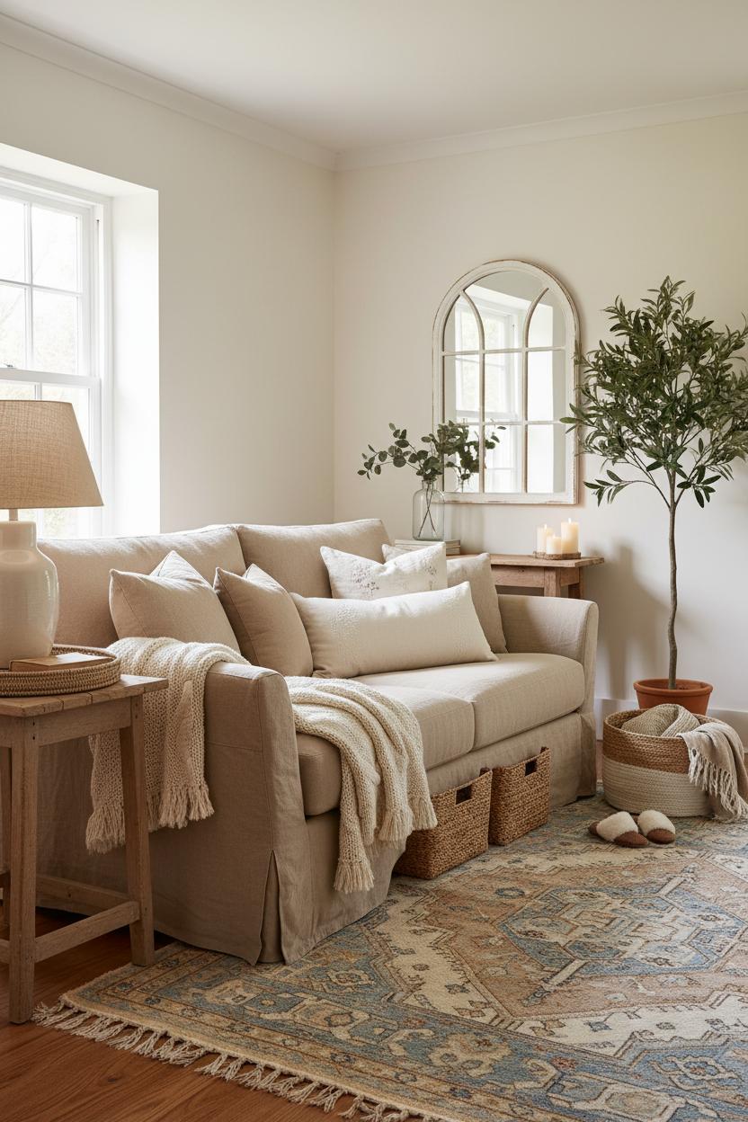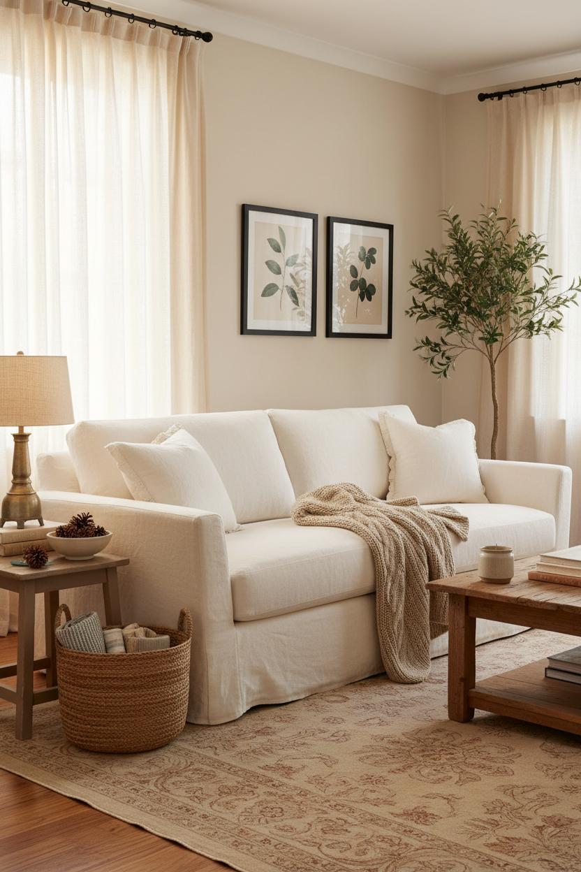 Styling is where the magic happens. Nestle the sofa by a window, angle a farmhouse table lamp for a warm pool of evening light, and let the rest of the room whisper rather than shout. A linen slipcover sofa bridges rustic living room charm with fresh simplicity, especially when paired with timeworn side tables, woven trays, and a few collected books. Tuck in a faux greenery plant for that always-alive look—olive, eucalyptus, or trailing ivy—and dot in a basket or two for throws and slippers. If your space is petite, float the sofa a few inches off the wall and use your rug to define a snug conversation zone; it’s one of those small living room ideas that instantly makes everything feel intentional. Keep the mood soft and organic with cottagecore decor touches like floral prints, candlelight, and a weathered mirror to bounce brightness around. The result is a room that feels as inviting as a handwritten note—casual, comforting, and ready for everyday living without any fuss.
