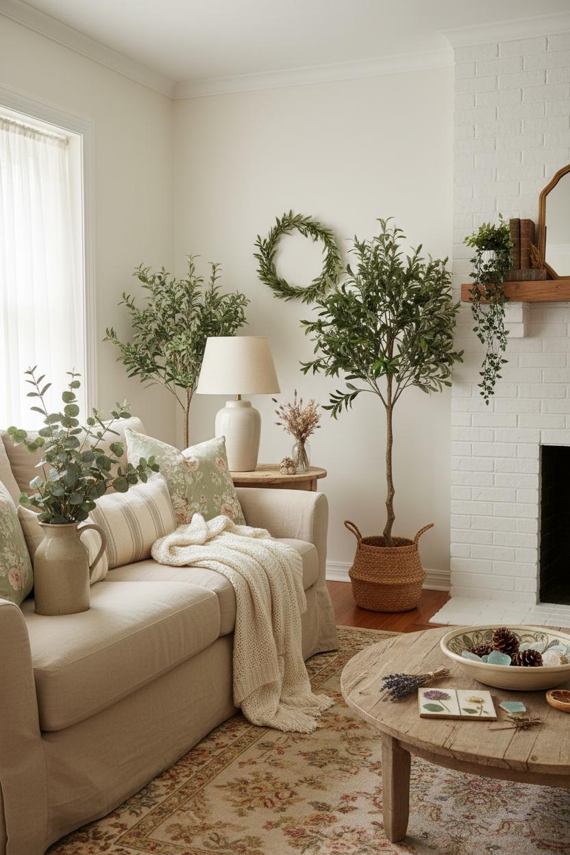 If you’re hunting for small living room ideas, think vertical and vignette-friendly. Tuck a slim faux greenery plant beside a window to draw the eye up, then echo the color with a petite bouquet of dried grasses on a side table. A simple wreath of preserved olive leaves on the wall adds quiet romance without crowding precious floor space. Corral collected treasures—pinecones, sea glass, pressed flowers—in a shallow bowl on the coffee table for a nature-inspired moment that feels personal. Ground everything with a vintage style area rug in faded florals or time-softened stripes; it warms the scheme and makes all those greens pop. For that cottagecore decor finish, repeat gentle patterns in cushions and keep your palette sunlit and soft, so each botanical—real or faux—reads as a calm, intentional accent rather than clutter. Rotate stems seasonally (think silvery eucalyptus in winter, airy bunny tails in summer) and let the plants be your chorus of color while the furnishings stay neutral. It’s a simple, soulful formula: layers of nature, low-maintenance greenery, and thoughtful texture that turn any corner into a storybook nook.
