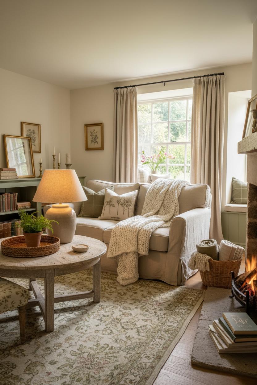 If you’re looking for small living room ideas, keep the palette tight and let the textures do the talking. Neutrals visually expand a room, while layers—wool, linen, nubby cotton, weathered wood—create depth that feels luxurious, not busy. Think of your surfaces as a story: a rustic living room coffee table in reclaimed timber, a stack of well-loved books, a ceramic bowl filled with pinecones in winter or seashells in summer. Mix soft curves with vintage silhouettes to lean into cottagecore decor; botanical prints in simple frames, a ruffled cushion, and a candle that smells like freshly baked bread are little details that make a big difference. Metals in aged brass or antique black bring warmth, while woven baskets corral blankets and magazines without clutter. Keep window treatments light—unbleached linen curtains that puddle just so—to diffuse daylight and maintain that cosy, cloudlike feel. The beauty of warm neutral decor is its year-round comfort: add berry-toned pillows for autumn, swap in striped ticking for spring, and your space effortlessly shifts with the seasons while staying soothing and cohesive. In the end, it’s all about creating a layered sanctuary where every touch invites you to linger—proof that the gentlest colours can make the strongest statement in a truly cosy cottage living room.