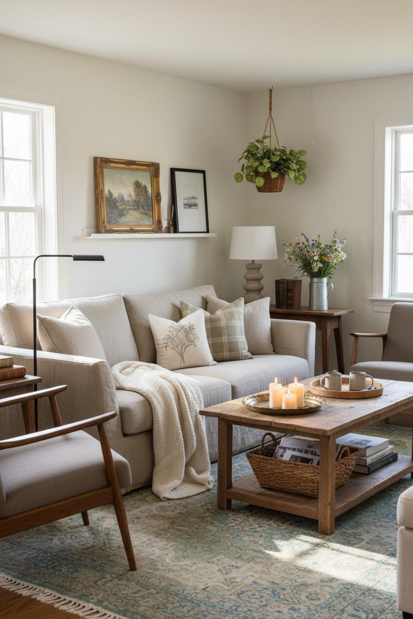 Finish with thoughtful styling that’s as practical as it is pretty. Opt for hidden-storage ottomans to stash throws and remotes, corral daily essentials on a wooden tray, and rotate seasonal accents so the room evolves without a full refresh. Swap pillow covers between nubby linen and soft plaid, layer in a botanical print or two, and let a stack of well-loved books anchor the vignette. The goal is a lived-in balance: modern comfort that respects the past, and vintage charm that never feels fussy. That’s the secret to a space you’ll keep coming home to—a timeless, collected mix that warms your room and settles beautifully into everyday life.