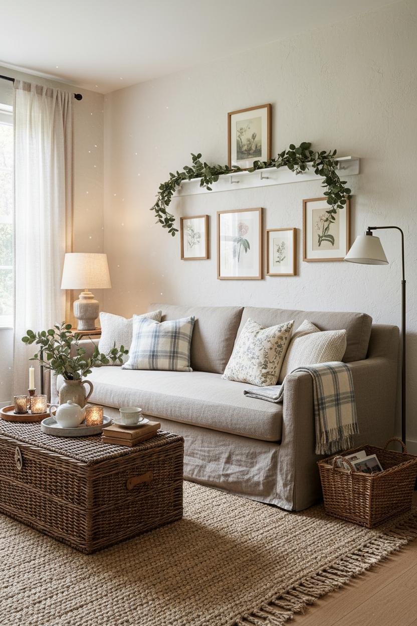 Texture is where the magic happens. Ground your seating with a jute area rug for that nubby, natural underfoot feel that nods to rustic farmhouse style, then pile on pillows in gentle checks, petite florals, and cozy knits. A plaid throw blanket tossed casually over the arm says “curl up here” better than any words. Layer in a woven trunk or vintage chest as a coffee table, a stack of timeworn books, and a wicker basket tucked by the sofa to corral remotes and magazines. For a whisper of greenery that never wilts, drape a faux eucalyptus garland along a mantel or over a simple peg rail above the sofa—instant softness and movement without the fuss.