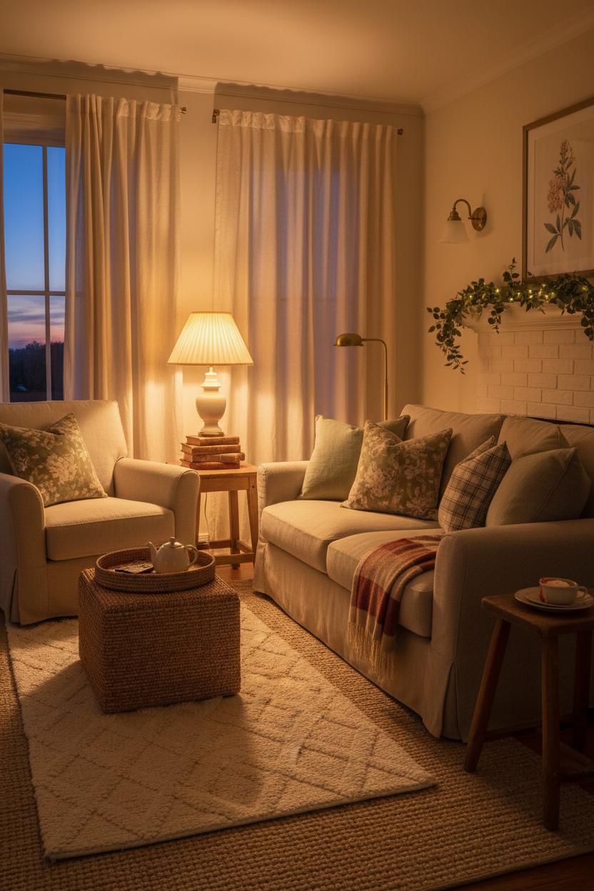When the sun dips and the kettle sings, layered lighting is what turns a room into a hug. Start with a gentle ambient glow and then build pockets of warmth wherever your eye wants to rest. A vintage style table lamp with a pleated shade, perched on a stack of old books, casts a soft circle of light that makes a corner instantly readable and irresistibly cosy. Tuck a slender floor lamp behind a linen slipcover sofa so light pools over cushions without taking up precious floor space, and let a pair of petite wall sconces free up the end tables. For small living room ideas that still feel luxurious, choose warm 2700K bulbs and add dimmers so you can slide from lively conversation to movie-night cocoon. Wind a faux eucalyptus garland along a mantel or shelf and weave in tiny fairy lights for that cottage-twinkle; it’s subtle, storybook magic that fits right into layered lighting and keeps your cosy cottage living room glowing even after the candles burn low.