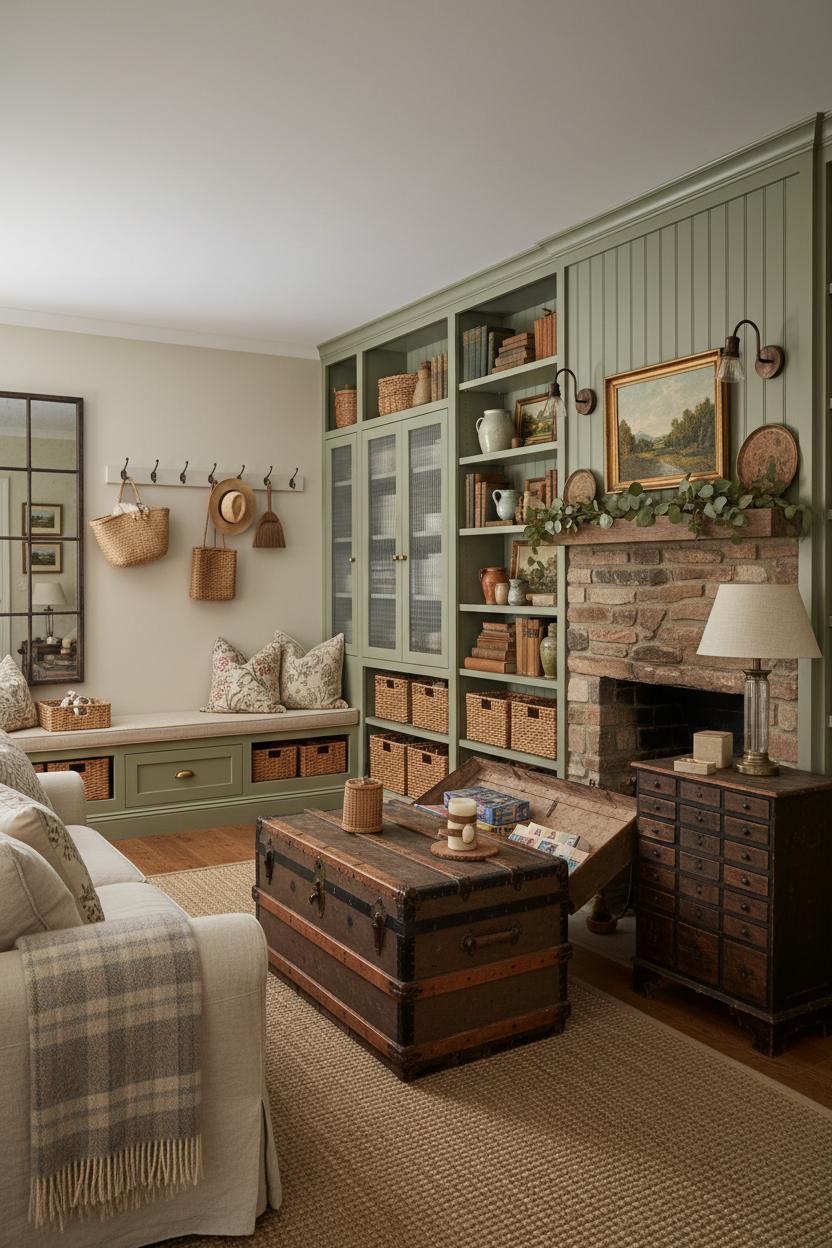 Storage can be storybook-pretty in a cosy cottage living room when you lean into antique finds and clever built-ins. Think timeworn treasures that earn their keep: a steamer trunk as a coffee table hiding board games and extra candles, an old apothecary chest corralling remotes and matches, or stacked wooden crates as end tables with room for magazines. Flank a fireplace with simple, shaker-style built-ins and beadboard backs for instant rustic farmhouse style, then tuck lidded baskets along the lowest shelves for throws and toys. A linen slipcover sofa softens all the wood and adds that relaxed, sink-in feel; drape a plaid throw blanket over the arm and you’ve nailed that cottagecore decor moment without trying too hard. Underfoot, a jute area rug grounds the space, its nubby texture a quiet counterpoint to gleaming pottery, ironstone pitchers, and framed landscapes arranged by tone and height. If you can, carve a window seat into a nook with deep drawers beneath—prime real estate for seasonal pillows, candles, and board games—and finish with simple shaker pegs along one side for baskets, hats, and handled dustpans that look as good as they work.