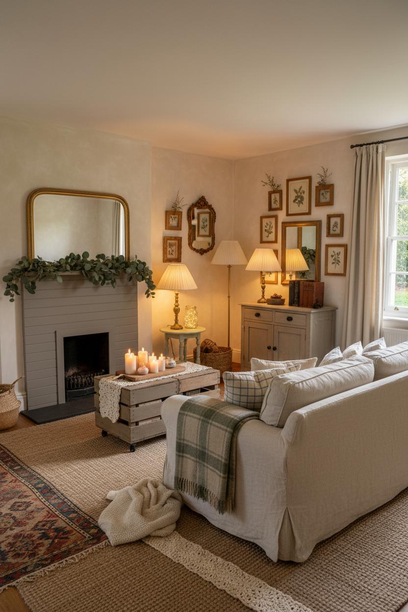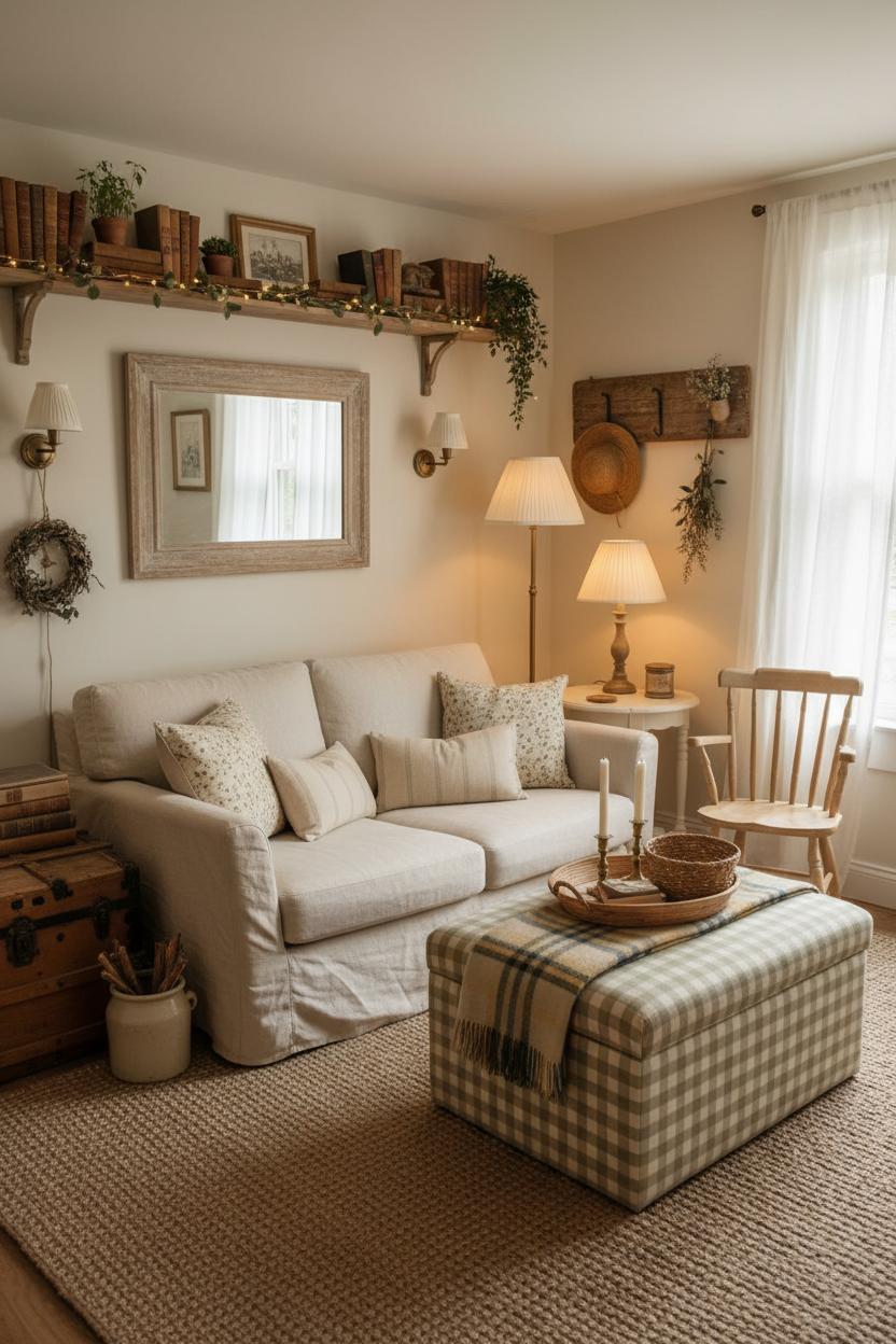 Light is your coziest accessory, so go all in on layered lighting. Combine a vintage style table lamp for a warm pool on the sofa corner, petite wall sconces with pleated shades to free up tabletops, and a discreet floor lamp to wash the ceiling and make the room feel taller. Add twinkle with fairy lights woven through that faux eucalyptus garland and the gentle flicker of candles on a tray. Mirrors opposite windows bounce daylight, while sheer drapes soften edges. Finish with timeworn notes—an old pine trunk, a distressed peg rail, a tiny crock for kindling—to root the room in story. Together, these small living room ideas create a snug, lived-in nest where cottagecore decor feels effortless and welcoming, proof that the tiniest rooms can hold the biggest comfort.