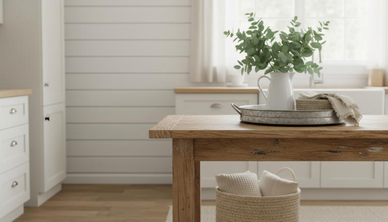 Layer texture like you’d layer seasons. Ground the space with a jute area rug for a nubby, natural base, then add pillowy cushions and a plaid throw blanket draped just-so for instant warmth. Mix tiny florals with gingham and stripes to nod to rustic farmhouse style without tipping into clutter; keep the palette soft—oat, sage, butter, and a hint of inky blue—to calm the eye. Tuck heirloom books and candlesticks on a tray, corral remotes in a woven basket, and trail a faux eucalyptus garland across a mantel or mirror for a wisp of greenery that won’t crowd the room. Let the surfaces breathe: a small stack here, a vase there, negative space in between.