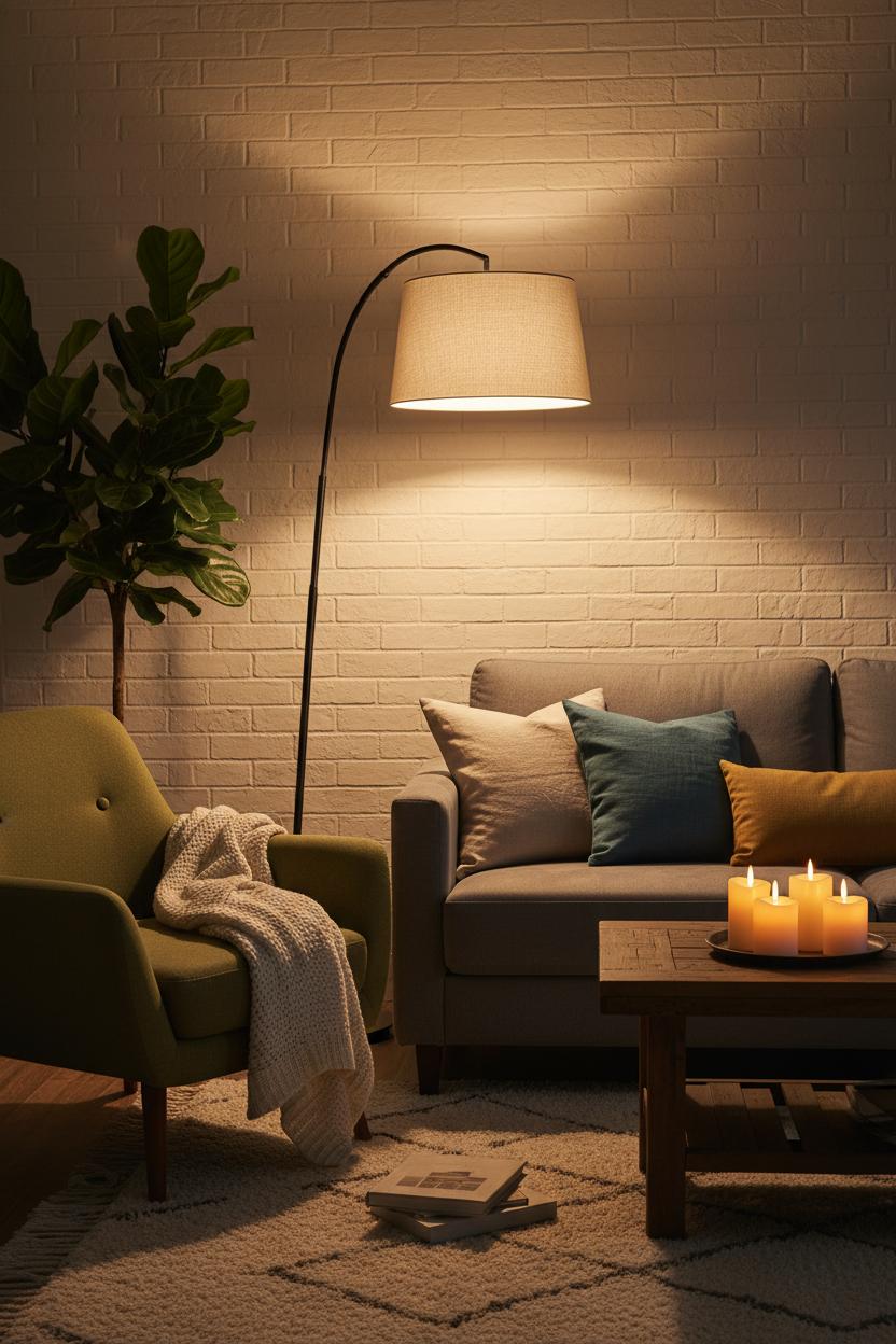 The magic multiplies when light meets texture. Layered textures catch and soften the glow, creating that hygge decor feeling we all crave. Drape a chunky knit throw over the arm of a chair, swap in linen pillow covers with subtle slubs, and anchor the scene with a soft area rug that begs for bare feet—each surface turns the lamp’s beam into a cosy living room cocoon. Add flicker-free ambience with flameless candles clustered on a tray, and let the dimmable floor lamp be your steady base layer while the candles sparkle like stars. If you love greenery, angle the light to skim across a plant; the shadows dance and your room gains instant depth. Keep overhead fixtures low or off to avoid flattening the mood, and let your floor lamp lead the light story—part task light for a book, part accent for art, all warmth. It’s the easiest upgrade with the biggest payoff: one switch, and your living room exhales.