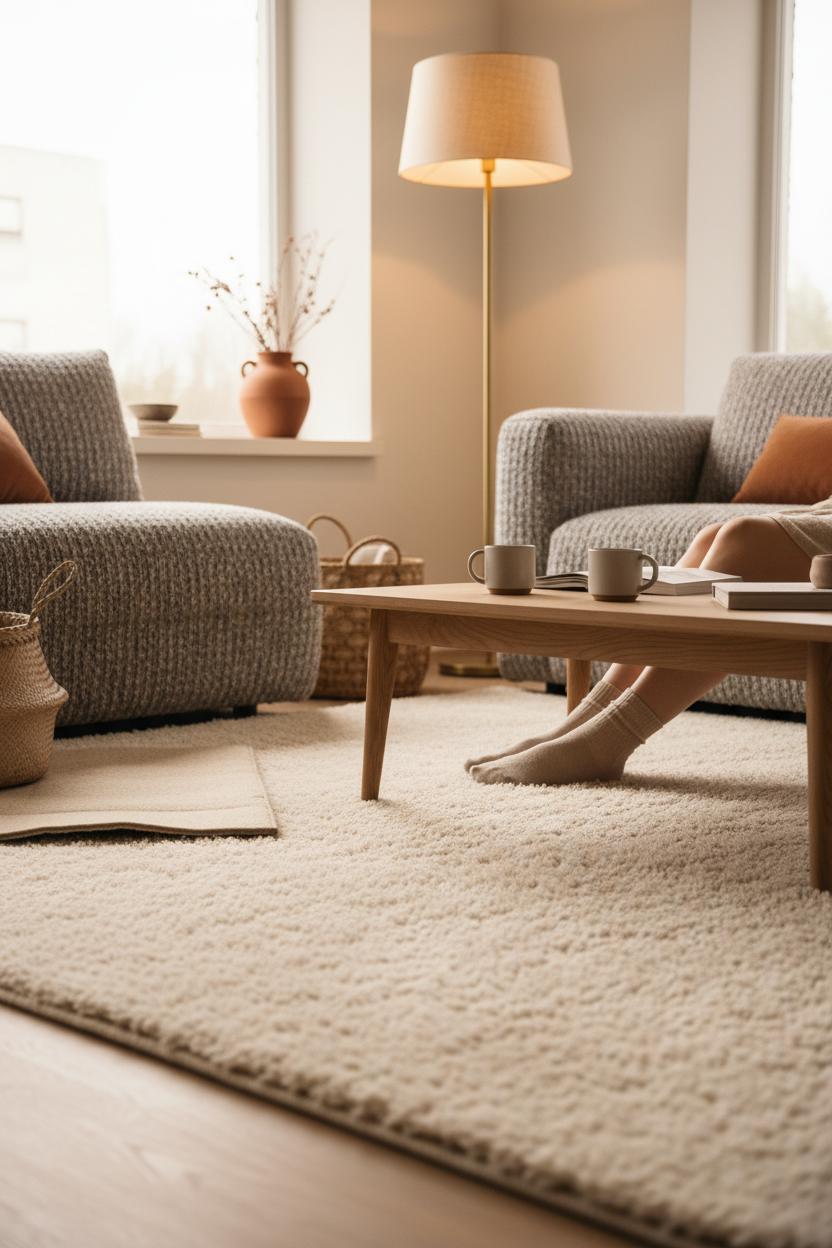 When you want that instant “ahh” feeling underfoot, start with a soft area rug that turns your space into a sanctuary. Think of it as the base layer of hygge decor: it grounds the room, softens sound, and sets the mood for lingering. Wool is the gold standard for plushness and durability, while ultra-soft polypropylene or microfiber offers cloud-like comfort without the price tag. Faux sheepskin adds a luxe touch in reading nooks, and cotton chenille feels wonderfully cosy for barefoot mornings. Whichever you choose, add a quality rug pad underneath—your feet (and your downstairs neighbours) will thank you. It adds cushion, keeps the rug from sliding, and boosts insulation, which is a quiet secret to a truly cosy living room.