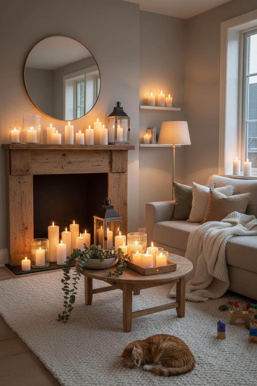 Style-wise, think of your candles as jewelry for your room. Place them inside glass hurricanes, rustic lanterns, or on a simple wooden board to add instant character. Then wrap the scene in layered textures: a chunky knit throw draped over the sofa arm, linen pillow covers in mellow neutrals, a soft area rug underfoot that grounds the vignette. The mix of matte wax, ribbed glass, warm wood, and nubbly textiles creates depth without clutter. For small living room ideas, lean into verticality—pop a candle trio on wall shelves, float a single taper on a narrow windowsill, and use a mirror to double the glow without taking up one extra inch of floor space.