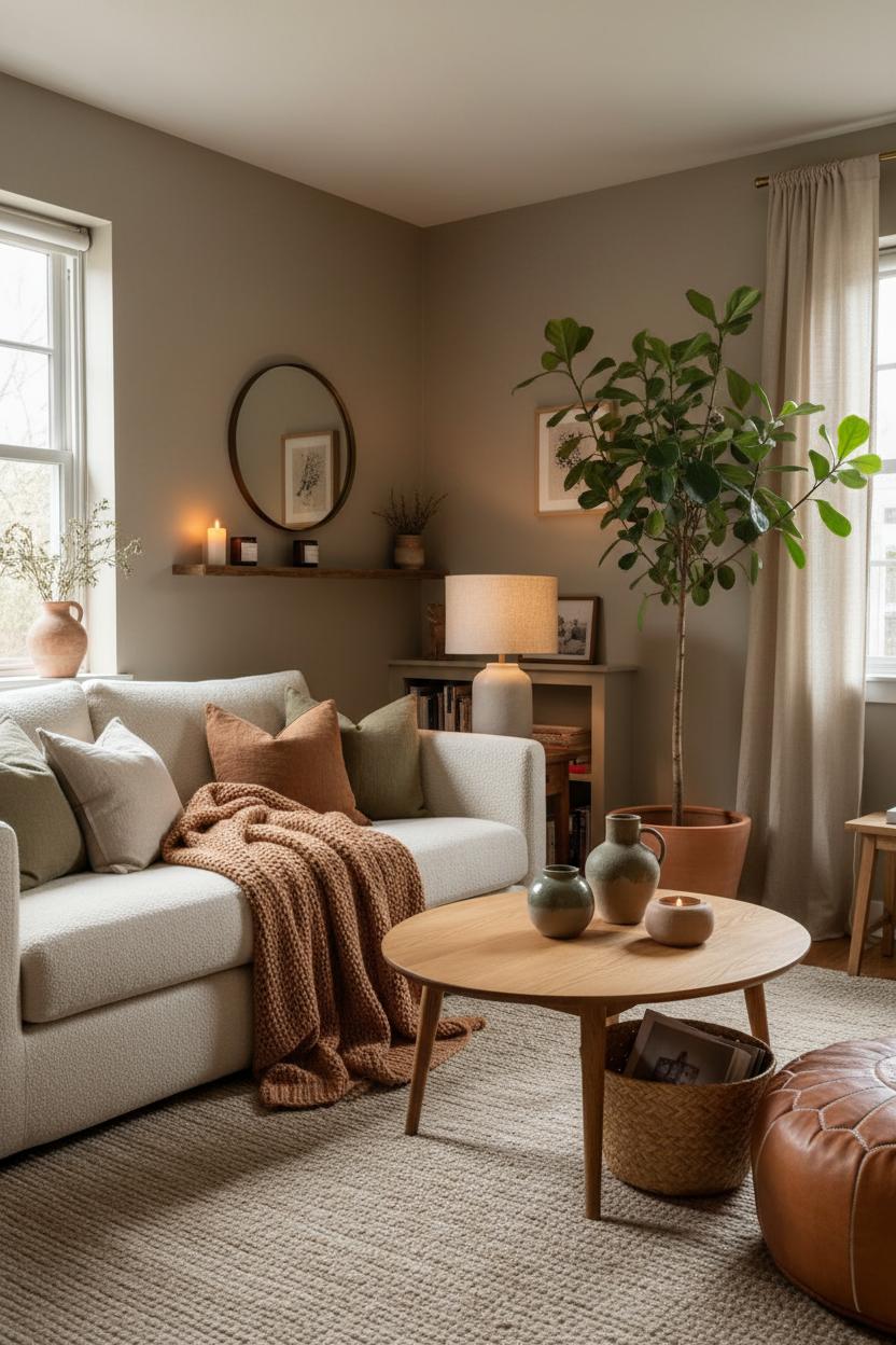 Lighting is your secret sauce. Aim for warm lighting that flatters your palette—bulbs around 2700K—and layer sources at different heights. A dimmable floor lamp with a linen shade sets the mood for evenings, while table lamps in ceramic or wood keep things softly lit without glare. Tuck flameless candles on shelves for a flicker without fuss, and consider amber glass to mellow the glow even more. When colours, materials, and light harmonize like this, the whole space hums—earthy, inviting, and effortlessly cosy, the kind of room that makes you exhale the second you walk in.