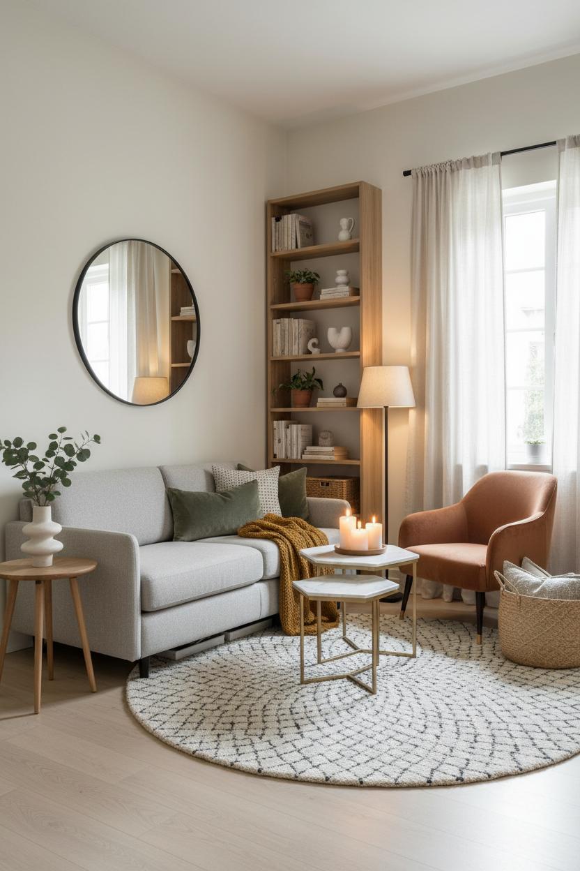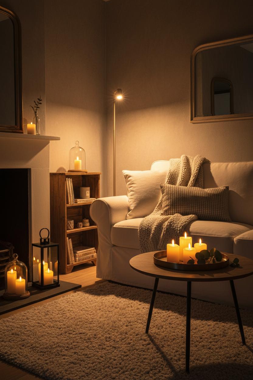 Lighting is where small changes have huge impact. Swap cool bulbs for warm lighting and watch the room soften; a dimmable floor lamp lets you glide from task to evening glow with a single dial. Cluster flameless candles on a tray for a safe, golden flicker you can “leave on” without worry, and let mirrors bounce that glow around the room. For small living room ideas that stretch the space, go vertical: a tall lamp, a slender shelving unit, and airy curtains hung high draw the eye up and keep things feeling open. Bring in nature for free—clippings in a jug, a branch on the mantle, a few pinecones in a bowl—to add texture and calm without clutter.