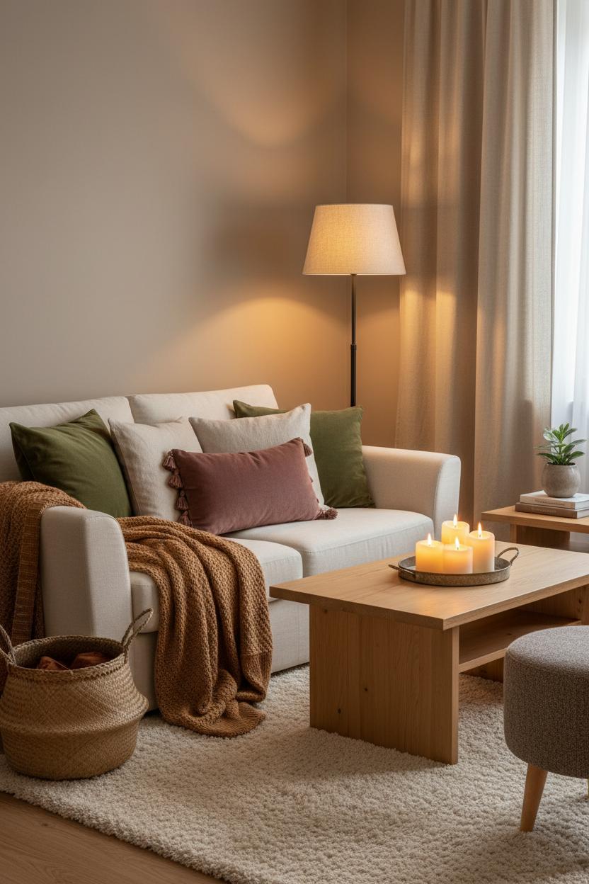 Bring the look down to earth with a soft area rug that feels cloudlike underfoot; it anchors your seating zone and sets the stage for everything above it. Then, make the most of warm lighting to flatter every fiber. A dimmable floor lamp pools light softly over textures, and flameless candles tucked on a tray add a golden flicker that makes velvet glow and wool look extra cosy. Aim for layered light at different heights—table, floor, and ambient—so the room feels wrapped rather than spotlighted. If you’re working with a compact space, repeat textures in small doses across the room (a linen curtain panel echoing those linen pillow covers, a petite wool footstool mirroring your throw) to tie everything together. Keep a woven basket nearby for quick tidying of blankets between movie nights. The result is a living room that looks thoughtfully collected and feels like an embrace—easy, welcoming, and ready for lingering.