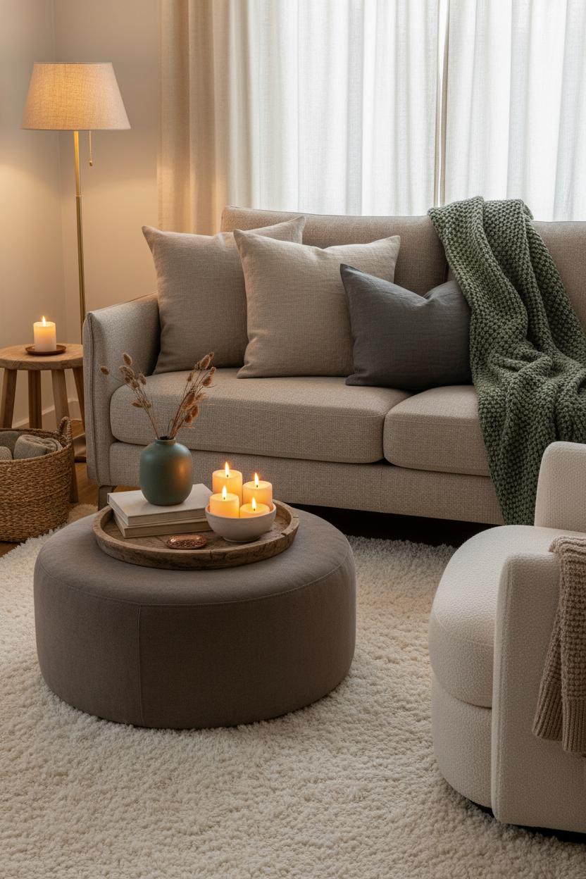 Finally, shape the mood (and the sense of space) with warm lighting instead of one bright overhead. A dimmable floor lamp in the corner gently washes the walls and makes the room feel larger at night, while flameless candles clustered on a tray bring that soft, flickering glow you can move wherever guests gather. Keep pathways clear—about the width of your shoulder span feels right—so nothing interrupts the flow between seating, doorways, and the next room. With a few smart shifts and tactile accents, your layout becomes quietly efficient, welcoming, and cocooning; proof that good design isn’t about having more furniture, but about making every inch earn its place.