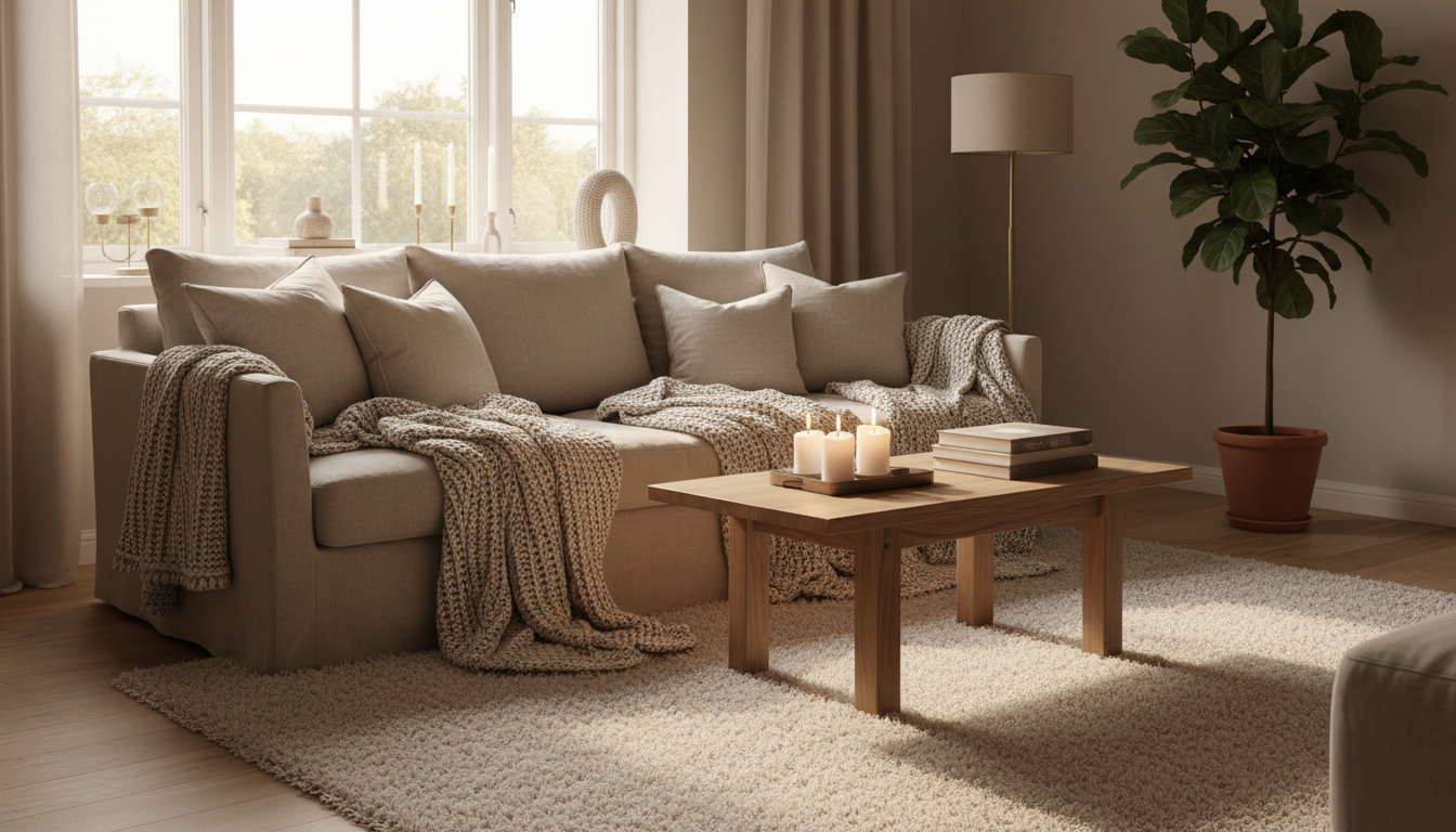 Once your sofa has that tactile moment, echo it around the room to build a cohesive cocoon. Anchor the seating area with a soft area rug that feels cloudlike underfoot, then layer in warm lighting—think a dimmable floor lamp for a gentle glow you can tune from reading to movie-night moody. Tuck a basket nearby with a second chunky knit throw so guests can grab one, and scatter a trio of flameless candles on the coffee table for flicker without fuss. These small touches lean into hygge decor, making every corner feel calm and lived-in. Keep surfaces simple, add a whisper of wood or rattan, and let a leafy plant soften the lines. If your pillows are seasonal, swap covers with the weather: breezy linen pillow covers in spring, tweed or faux shearling in winter, always playing off the knit’s cozy heft. The result is a layered, tactile landscape that looks styled but never staged—a truly cosy living room where the textures invite touch, the lighting flatters the room and you, and the sofa practically calls you over for one more chapter.