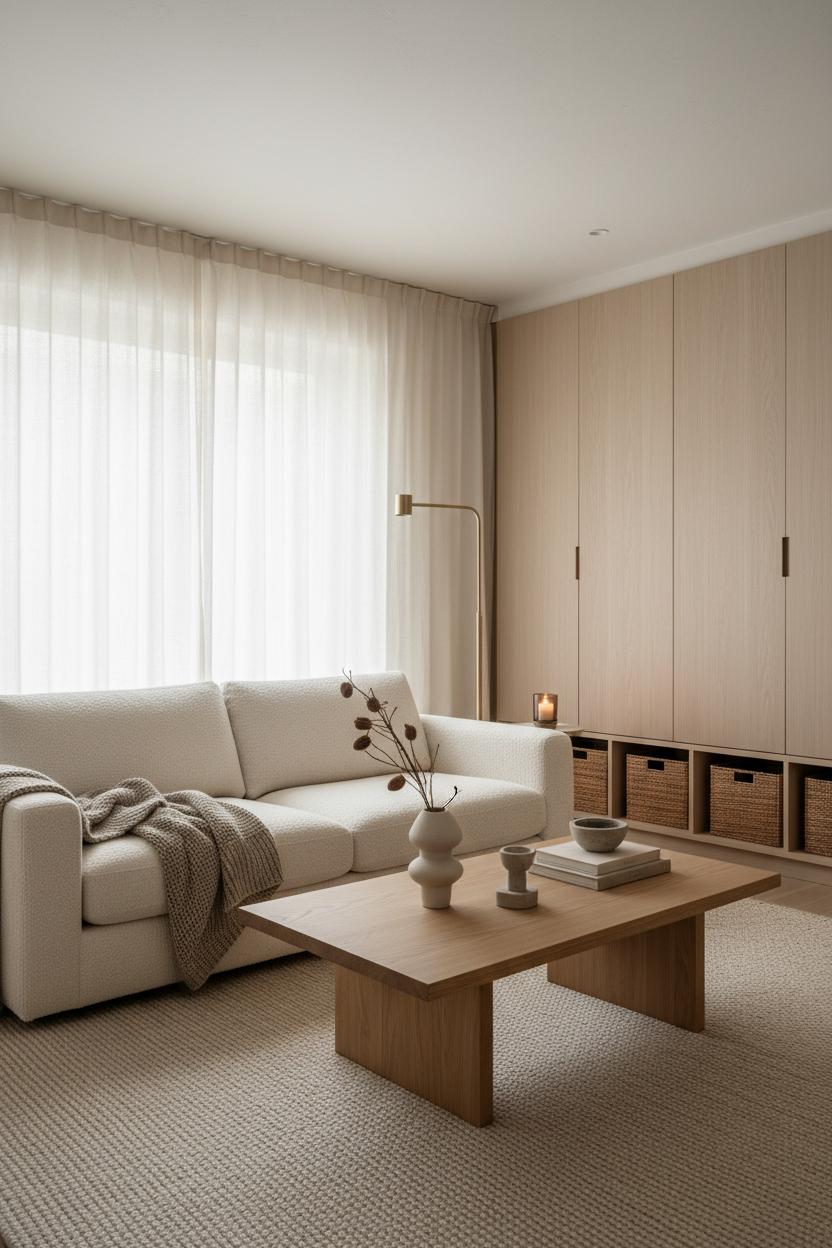 Edit your accents to a few pieces that speak clearly. A single ceramic vessel with branches, a short stack of well-loved books, a sculptural bowl—done. Tuck visual noise away with woven baskets and closed storage so surfaces can breathe. Keep the layout generous around pathways and give furniture a little room from the walls; that extra inch of air reads as luxury. For cozy home ideas that still feel streamlined, play with layers of light (overhead, the brass floor lamp, and a candle), add a throw in a chunky knit, and let texture carry the coziness rather than clutter. This is minimalism that lives well: quiet, tactile, and timeless—proof that with fewer pieces, your neutral decor can make a bigger, more beautiful impact.