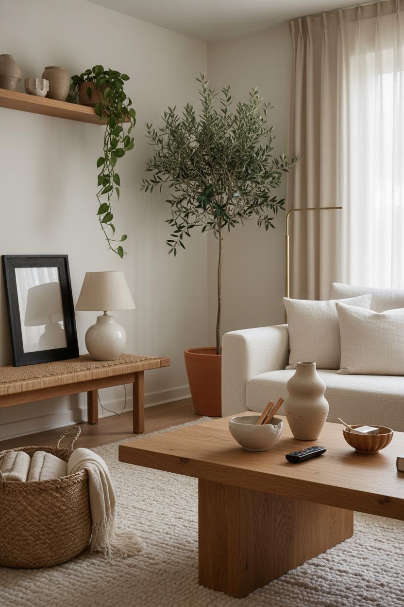 Greenery ties everything together. A potted olive tree or rubber plant brings quiet movement and a wash of soft green that flatters neutrals, while trailing pothos on a high shelf adds an easy, romantic drape. If you’re working with small apartment style, go vertical: wall shelves for petite planters, a slim plant stand near the window, and narrow floor pots that tuck beside the sofa. Linen curtains filter light so leaves glow during the day, and come evening, a brass floor lamp casts a warm, flattering pool of light that makes the whole room exhale. With wood under hand, ceramics catching the light, and plants softening the edges, your neutral decor reads intentional and inviting—exactly the kind of modern minimalist living room you’ll want to curl up in night after night.