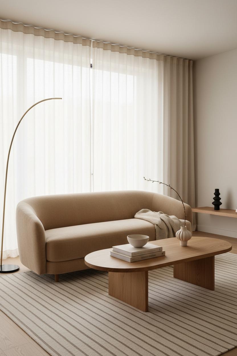 Next, layer underfoot with a textured area rug that grounds the seating area and adds dimension without busy pattern. A low-contrast weave or tonal stripe can subtly zone the space, which is especially helpful for small apartment style. For lighting, think of a brass floor lamp as jewelry for the room—its warm metallic glow plays beautifully with wood tones and boucle, and an arched or slim profile slips into a corner without crowding. If your windows need softening, linen curtains are a must; hang them high and wide to elongate the room and filter light into a flattering haze. This combination—boucle sofa, oak coffee table, textured area rug, brass floor lamp, and gauzy linen—creates a layered foundation you can tweak season to season. Swap pillow covers for tonal variety, fold a ribbed throw over the arm, and introduce a single sculptural object to keep things fresh. The key is texture over pattern, curves over clutter, and materials that feel good to the touch. It’s one of the easiest cozy home ideas to execute: keep scale in mind (an oval table and apartment-size sofa are perfect for tighter footprints), let negative space do its quiet magic, and let the materials lead. The result is a serene, light-filled living area that reads neutral yet rich—effortless modern minimalist with a cozy soul.