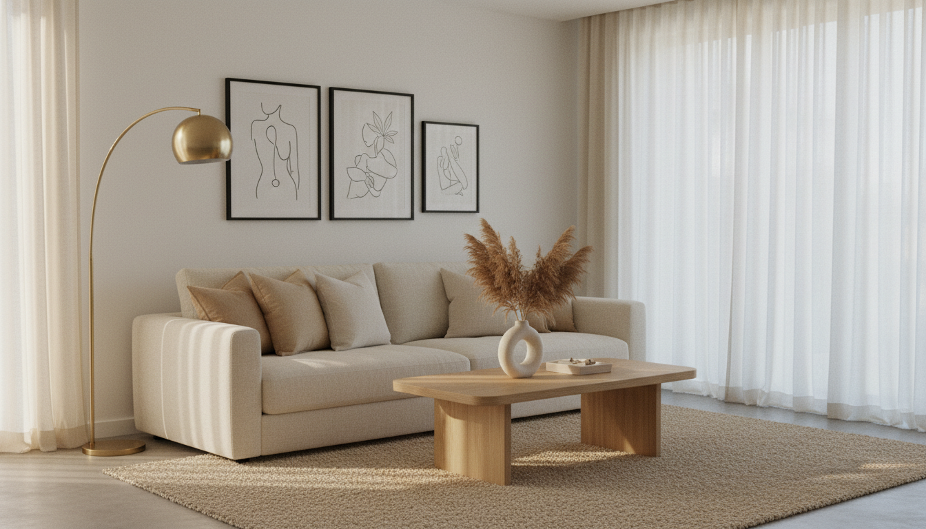 Choose one or two heroes and let them set the tone. A nubby boucle sofa brings the touchable softness that makes minimalism feel warm rather than stark, while an oak coffee table with clean lines adds grounded, organic structure. Anchor the seating with a textured area rug in a tone-on-tone weave to introduce depth without loud pattern, then layer in a single gleam—a brass floor lamp—to cast a welcoming glow at dusk. If your windows need soft framing, linen curtains filter light into a gentle haze, adding movement and that lived-in ease we love. With modern minimalist styling, materials are your patterns: wood grain, brushed metal, natural fibers, and the subtle shadows they create throughout the day.