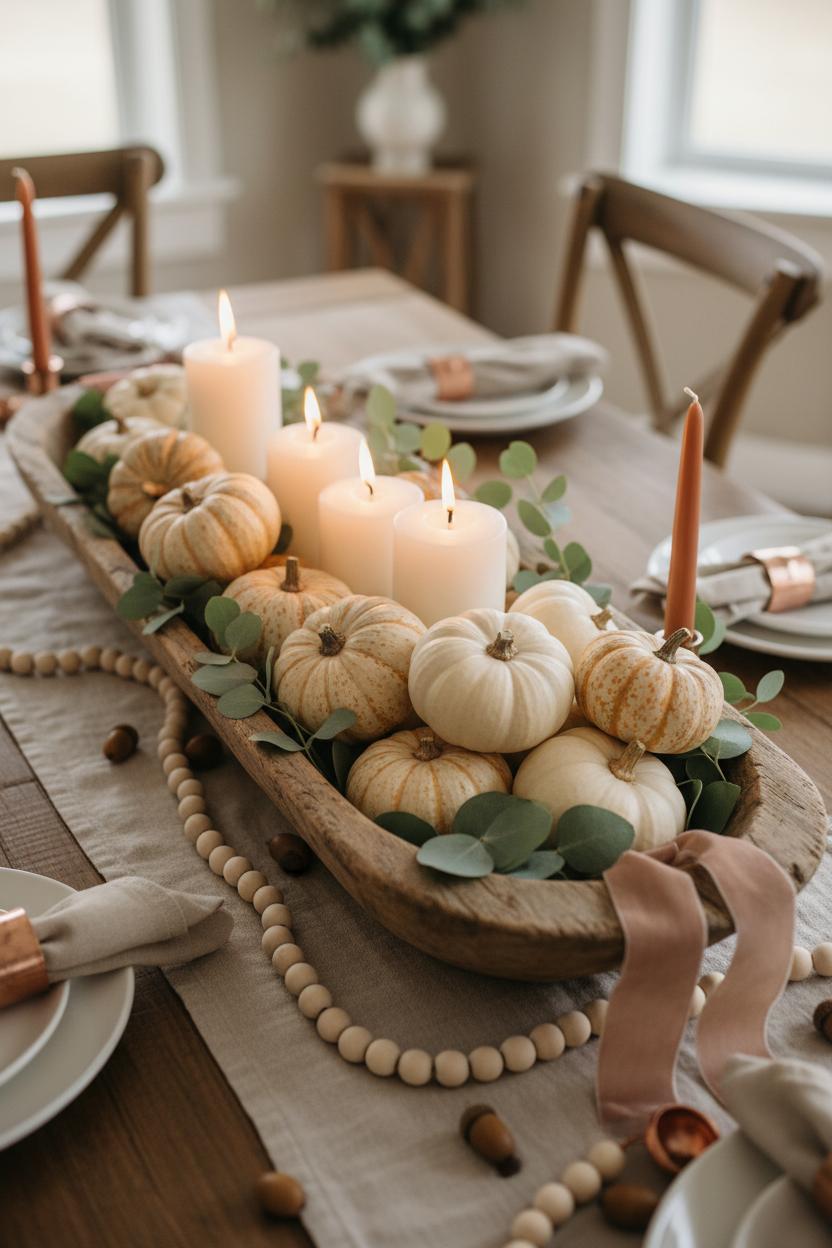 Choose a mix of mini pumpkins in creamy whites, soft oranges, and speckled shades, and cluster them in odd numbers so the arrangement feels organic, not fussy. Tuck eucalyptus stems (fresh for fragrance, or faux for longevity) between the pumpkins, letting the silvery leaves spill naturally over the edges. The contrast between the smooth pumpkin skins and the feathery greenery creates that elegant-meets-cozy vibe that works for everyday autumn centerpiece ideas and also scales beautifully into a Thanksgiving centerpiece. If your table is long, repeat the trio of pumpkins-eucalyptus-candles down the runner, leaving just enough negative space so guests can set a glass without bumping into your display.