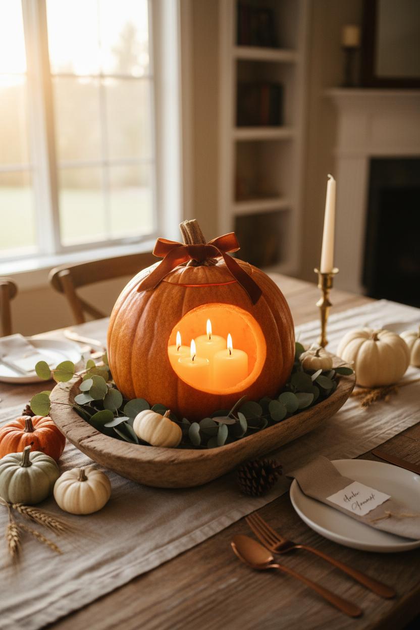 Picture this: golden hour pouring across your dining room, a soft linen table runner grounding the scene, and a warm glow flickering from a pumpkin centerpiece right in the middle. For one of my favorite autumn centerpiece ideas, I hollow out a medium pumpkin and nestle a trio of pillar candles inside, letting the light dance against the curved, speckled skin. A loose collar of eucalyptus stems spills around the base, their silvery green leaves adding that just-foraged feel we love in fall table decor. Scatter a few mini pumpkins in varying sizes and hues—creamy whites, soft sages, classic orange—so it looks effortless and abundant. It’s simple, cozy, and incredibly inviting, the kind of styling that makes even a Tuesday night feel special.