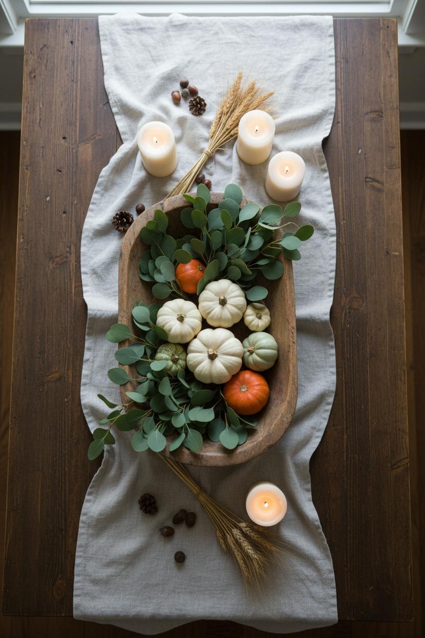 Once your linen table runner is down, build a relaxed pumpkin centerpiece right on top. Place a wooden dough bowl in the center and let it feel abundant but not crowded. Tuck in handfuls of eucalyptus stems so they spill softly over the sides, then nestle a mix of mini pumpkins in between the greenery for that perfectly imperfect, gathered-from-the-market look. Thread a few pillar candles along the length—varying heights keep the eye moving, and a trio down the middle adds a warm flicker without blocking conversation. If you want even more dimension, scatter a few acorns, wispy wheat, or pinecones along the runner so the whole vignette feels collected rather than staged. It’s a formula I come back to again and again when I’m brainstorming autumn centerpiece ideas because it works for both weeknight coziness and weekend gatherings.