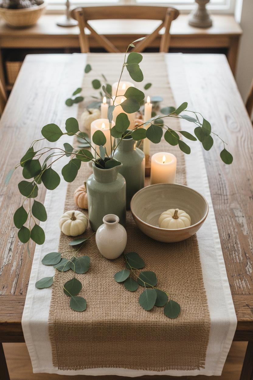 Color and scale make all the difference. Keep the palette soft—sage, clay, ivory—so the eucalyptus does the heavy lifting and the pumpkins feel like accents. Vary the stem lengths so some spill over and others stand tall, and leave negative space so the arrangement can breathe. This setup transitions seamlessly into a Thanksgiving centerpiece: simply layer in a few more pillar candles, swap one ceramic vessel for a larger urn to anchor the middle, and add a handful of deeper-toned pumpkins or dried seed pods for extra depth. The result is fall table decor that looks styled without screaming “the store did this”—organic, touchable, and wonderfully cozy, as if the season just wandered in and made itself at home.
