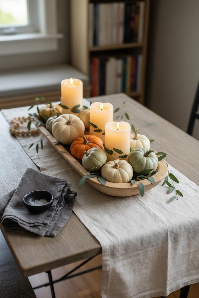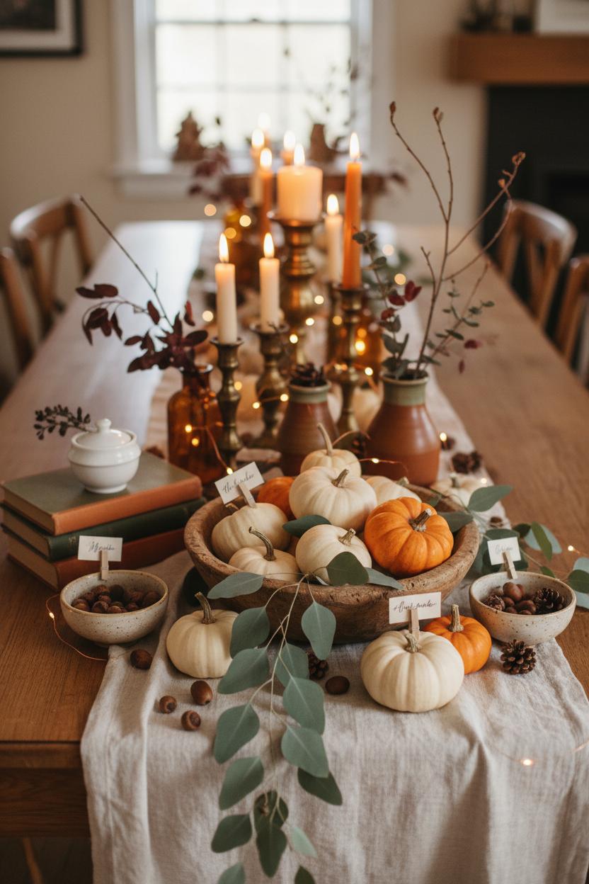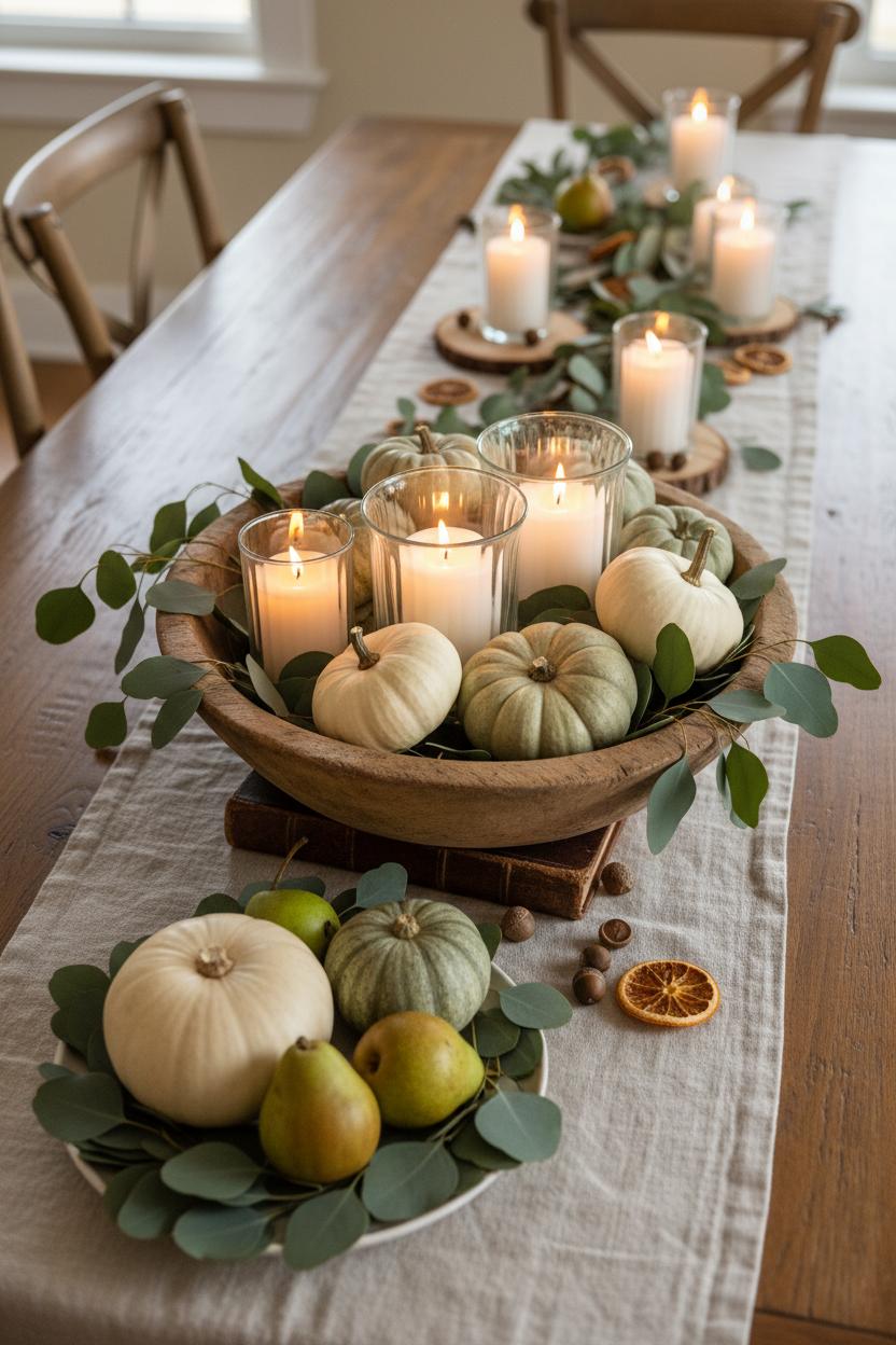Start by setting a soft foundation for your fall table decor with a linen table runner in a cozy oatmeal or warm taupe. That simple layer instantly calms the eye and invites texture. Next, nestle a wooden dough bowl down the center and tumble in a mix of mini pumpkins in creamy whites and muted sage, then weave eucalyptus stems throughout so the greens spill a little over the edge. Slip a few pillar candles in varying heights between the pumpkins (tucked into glass hurricanes or heat-safe cups), and let the gentle flicker bounce off the pale squash and silvery leaves. The look feels collected, not fussy—low enough for lingering conversation, yet rich with those earthy tones we crave in October. If you love a touch of sparkle, add a scatter of brass bells or tiny acorns, and let the patina play against the fresh eucalyptus for an effortless, layered glow.