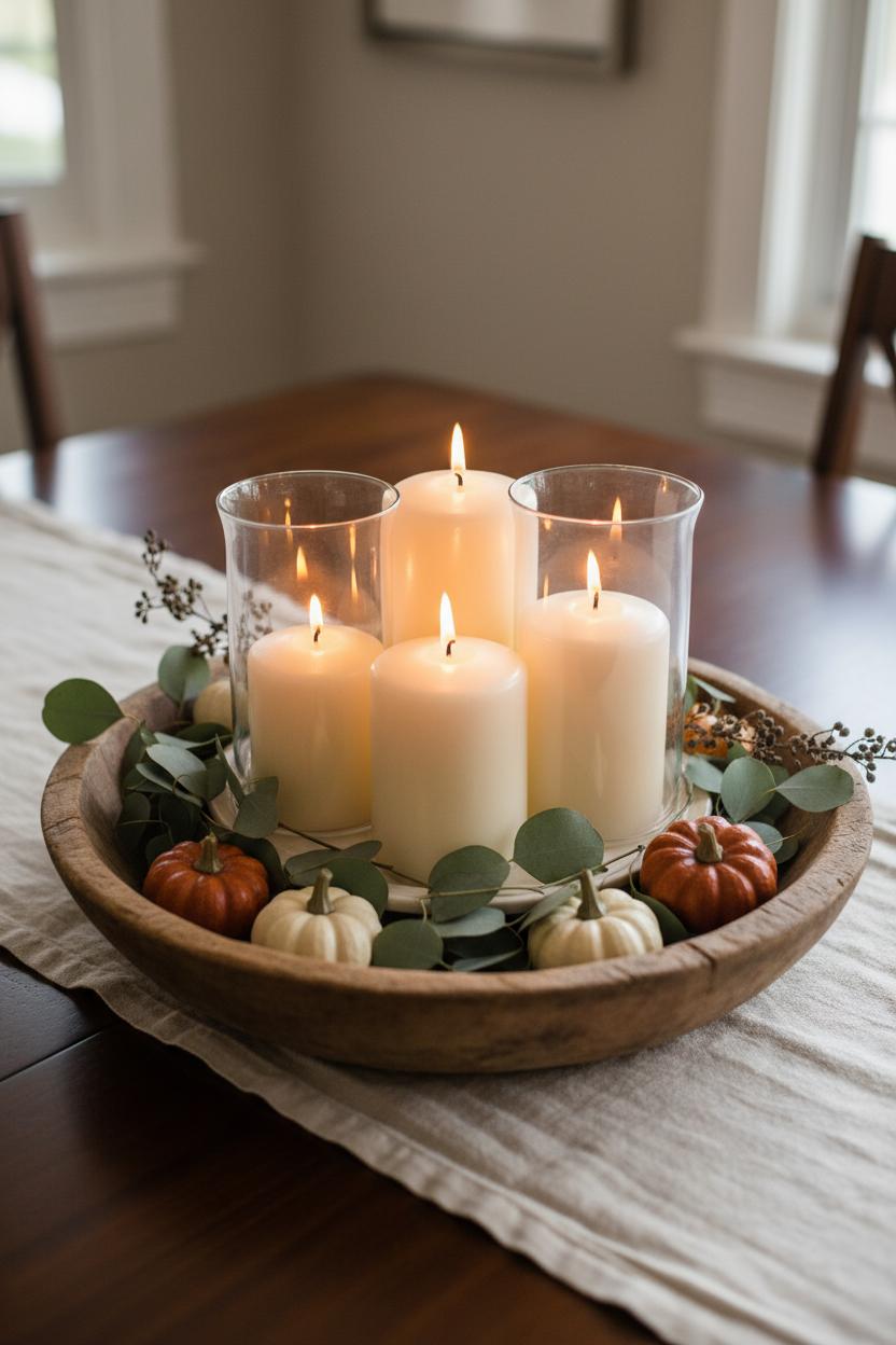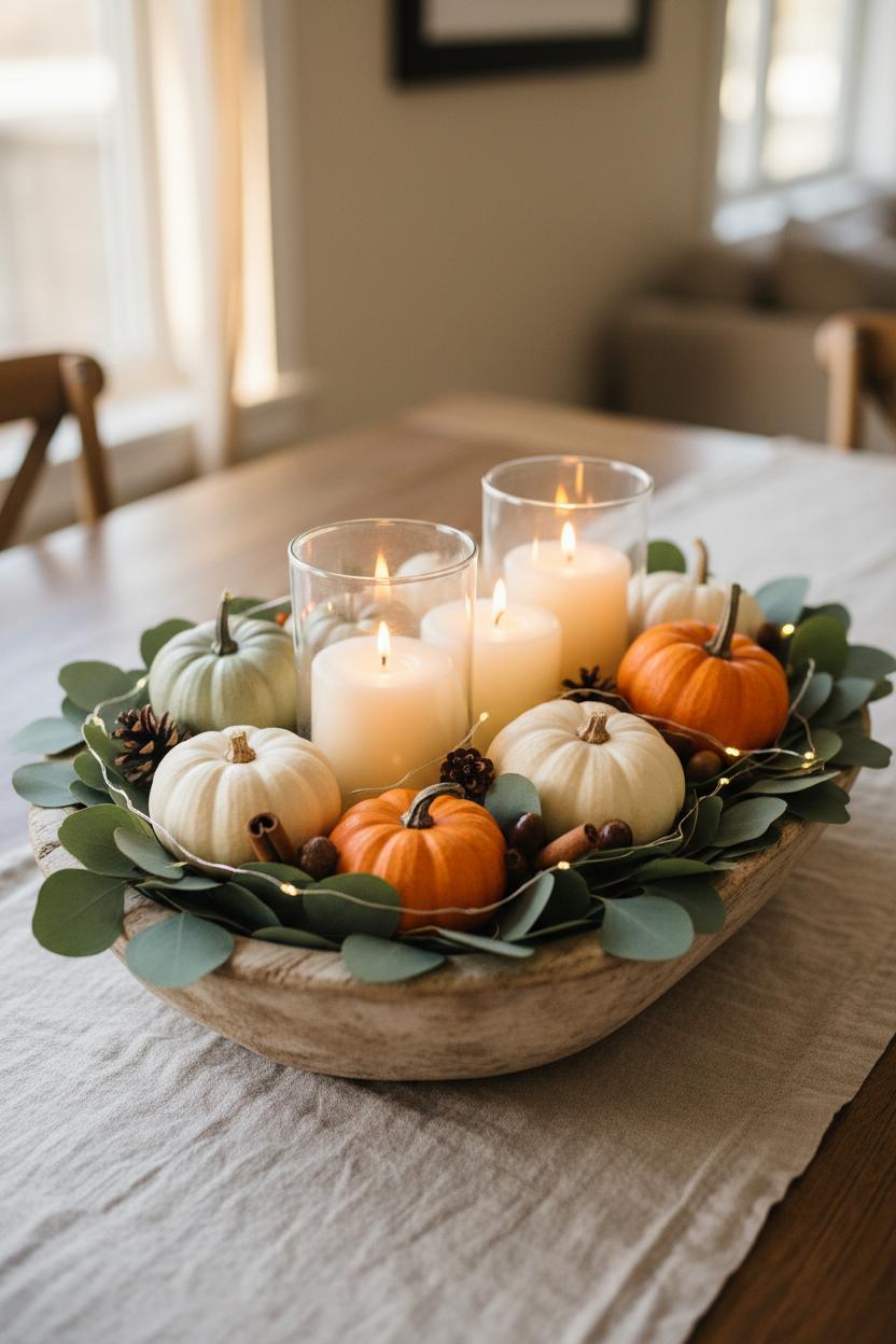 Now, work in the stars: mini pumpkins in a mix of creamy whites, soft sage, and traditional orange. Cluster them in odd numbers, starting with your largest pieces toward the center, then tapering outward. Tuck pumpkins directly into the eucalyptus, wiggling them until they feel snug; if you need extra lift, slip a coaster or folded napkin underneath to cheat the height. Sprinkle small accents—pinecones, acorns, a few cinnamon sticks—where you see little “pockets” of space. Step back and check from all angles, rotating the bowl slightly until the colors feel balanced and the textures play nicely. A thin, battery-operated strand of twinkle lights can weave through the stems for a soft sparkle once the sun goes down. The result is a pumpkin centerpiece that feels elevated yet effortless, a go-to for autumn centerpiece ideas that transition beautifully from everyday fall table decor to a welcoming Thanksgiving centerpiece. With its organic greenery, gentle candlelight, and gathered harvest touches, this arrangement leans into rustic table styling without feeling heavy. Keep a few extra pumpkins and stems nearby to refresh the bowl throughout the season; swap in deeper-toned eucalyptus or richer candle colors as November approaches. It’s simple, tactile, and oh-so-inviting—just the kind of touch that makes your table feel like home.
