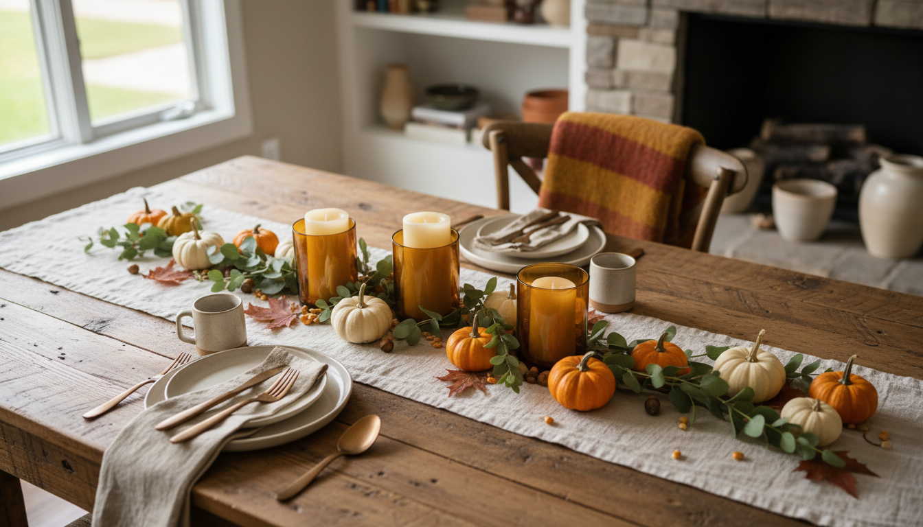 If you’re craving that effortless mix of cozy and fresh for fall table decor, start with a simple foundation and let texture do the heavy lifting. I love to lay down a soft linen table runner in a warm neutral—think oatmeal or greige—so everything that follows looks intentional and layered. Then bring in a low, elongated vessel like a wooden dough bowl; its timeworn grain sets the tone for rustic table styling and instantly makes even a small gathering feel special. Nestle a few pillar candles down the center for height and glow, leaving pockets of space for the stars of the show: mini pumpkins and eucalyptus stems.