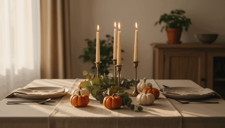 If your dining nook is more bistro than banquet, this little pumpkin centerpiece is proof that small can still be stunning. One of my favorite autumn centerpiece ideas for tiny spaces starts with a narrow base—think a wooden dough bowl or a slim tray that won’t eat up your place settings. Lay down a soft linen table runner to anchor the look, then nestle a mix of mini pumpkins along the center. Tuck in wispy eucalyptus stems so they spill over the edges just a touch, and finish with two or three petite pillar candles for that buttery glow that makes everything feel cozy. It’s layered, textural, and unbelievably simple—fall table decor you can pull together in ten minutes with grocery-store pumpkins and a few market stems.