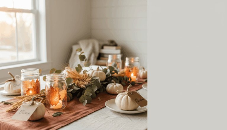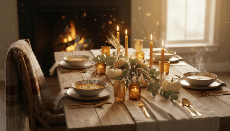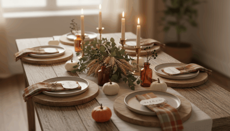 Ready to cozy up your table? Explore autumn centerpiece ideas that blend pumpkins and eucalyptus into effortless fall table decor. From a simple pumpkin centerpiece with mini pumpkins and eucalyptus stems to a show-stopping Thanksgiving centerpiece, we’ll layer pillar candles and a soft linen table runner for warmth. Prefer rustic table styling? Try a wooden dough bowl filled with greenery and gourds. These easy, affordable looks bring fresh texture, gentle fragrance, and golden glow to every meal, whether it’s weeknight soup or a festive feast.