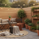 Multifunction is your best friend on a DIY patio. A vintage trunk, sealed for the elements, doubles as a coffee table and storage; a lightweight bar cart moonlights as a beverage station and a mini potting bench. Garden stools are the MVPs of small spaces—use them as side tables today and extra seating tomorrow. If you love a farmhouse porch look, repurpose a galvanized tub with a wood round on top for a table that hides garden tools. Rail-hugging planter set pieces create a soft, leafy privacy screen while keeping the floor open; choose nesting sizes so they corral kids’ toys or outdoor dining linens when the party’s over. Overhead, drape outdoor string lights to “raise” the visual ceiling and frame the coziest glow—instant ambiance that makes even the tiniest nook feel intentional.