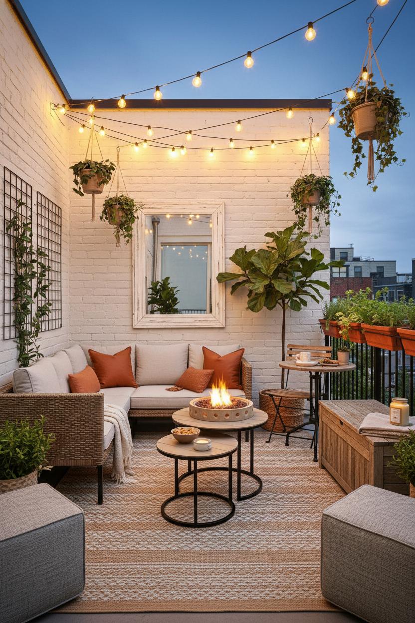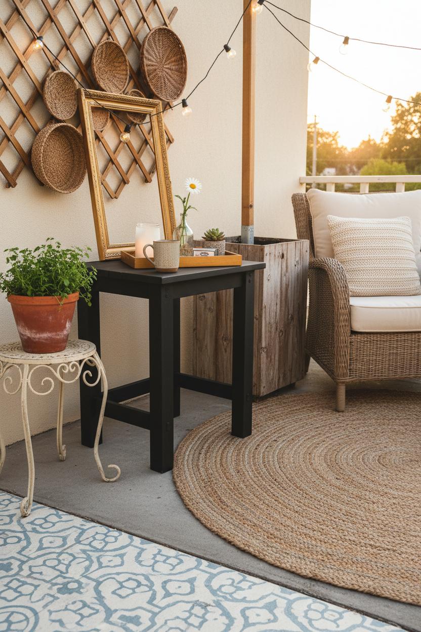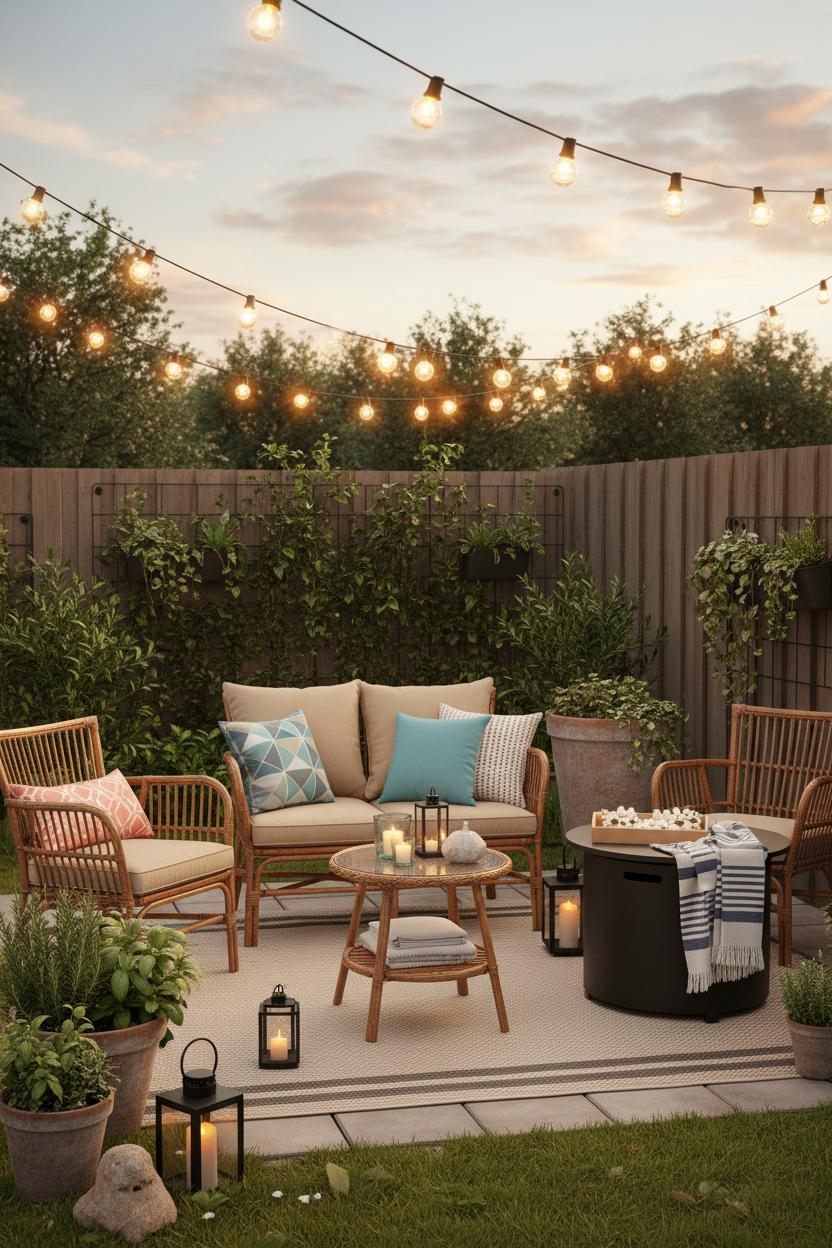 When your square footage is sweet and small, think in zones and layers to create a cozy nest of outdoor seating. Start by anchoring the area with an outdoor rug that defines your “room” and softens the floor under bare feet. Tuck an L-shaped bench into a corner to maximize every inch, then add plush cushions and a couple of nesting tables that slide out when company comes. Low-profile rattan patio furniture keeps the look airy while still feeling substantial, and a slim bistro set or rail-mounted bar ledge can double as a dining spot without stealing precious space. Go vertical with planters: hang a few from the ceiling line, mount a narrow trellis for climbing greens, and try railing boxes for herbs so your patio decor feels lush without crowding the floor. String outdoor string lights overhead in a gentle zigzag to draw the eye up and wash everything in that golden, café-style glow—instant ambiance for a budget patio.