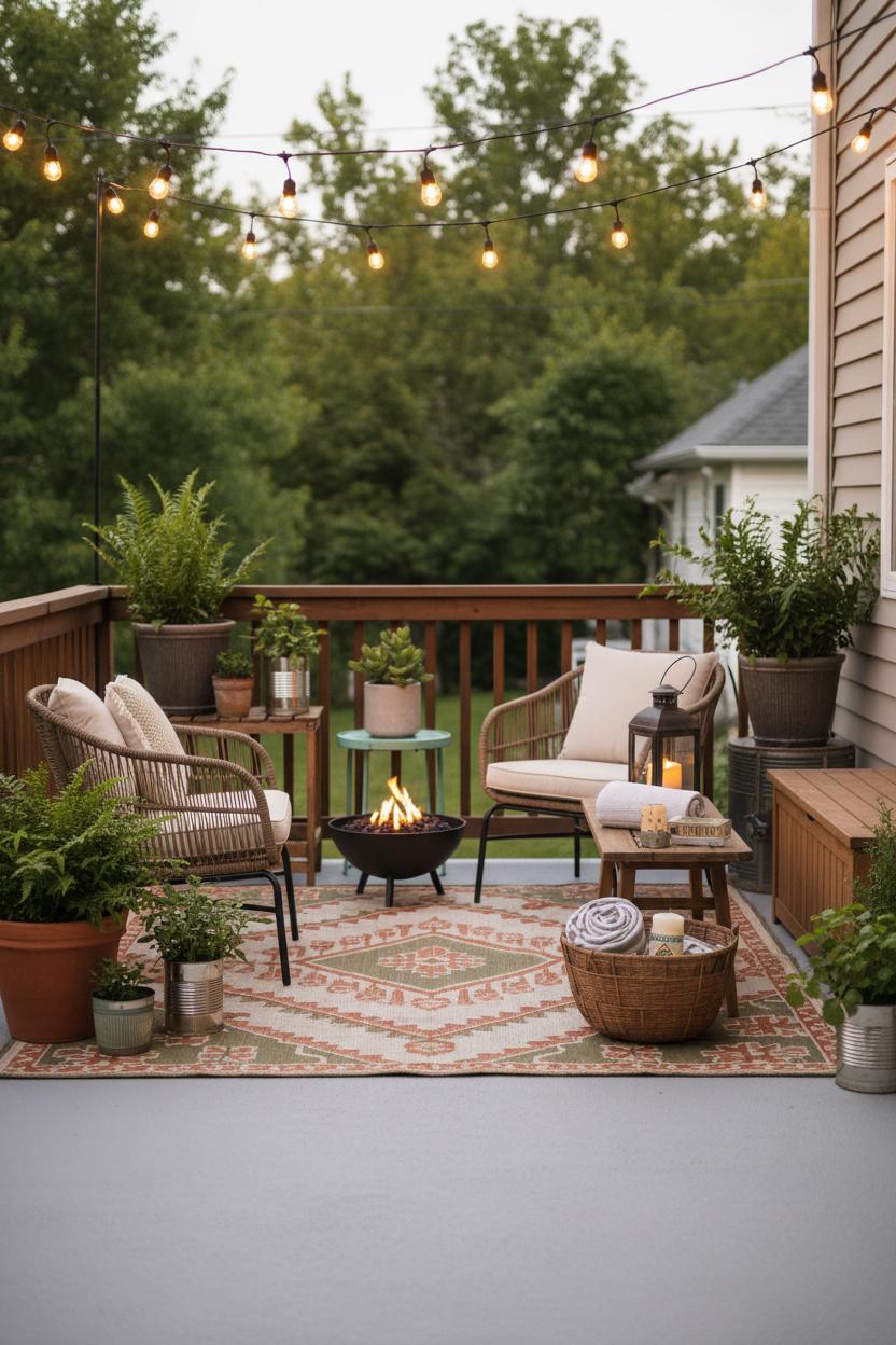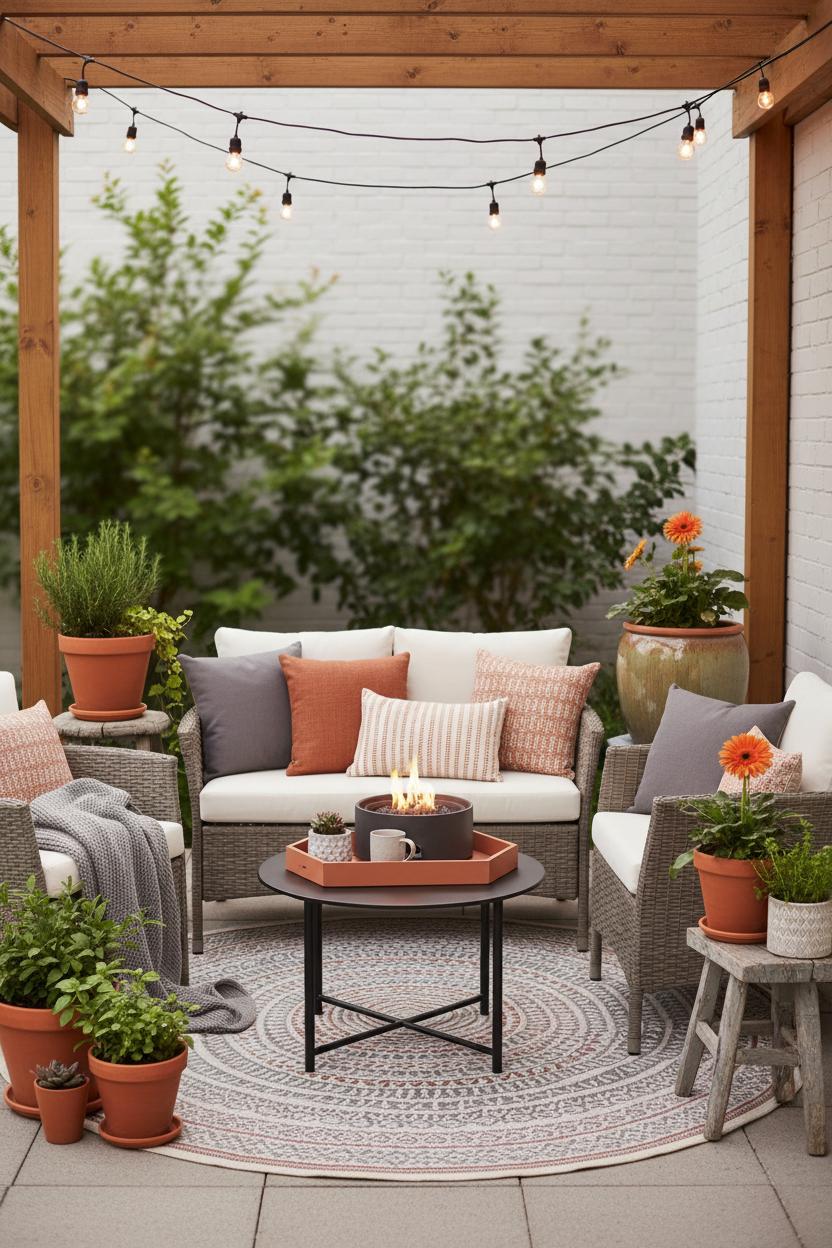 Rug sizing is your secret weapon: aim for the front legs of your chairs to sit on the outdoor rug so the seating area feels anchored. Polypropylene weaves are budget‑friendly, durable, and easy to hose off, while natural‑look textures keep things cozy. Layer in warmth with outdoor string lights draped overhead or along a railing, and consider a compact propane fire pit or tabletop version for flickering ambiance on cool evenings. Finish with a few thrifted finds—an old stool as a plant stand, a painted tray for the coffee table—and you’ve got patio decor that feels curated, comfortable, and completely you, all without overspending.