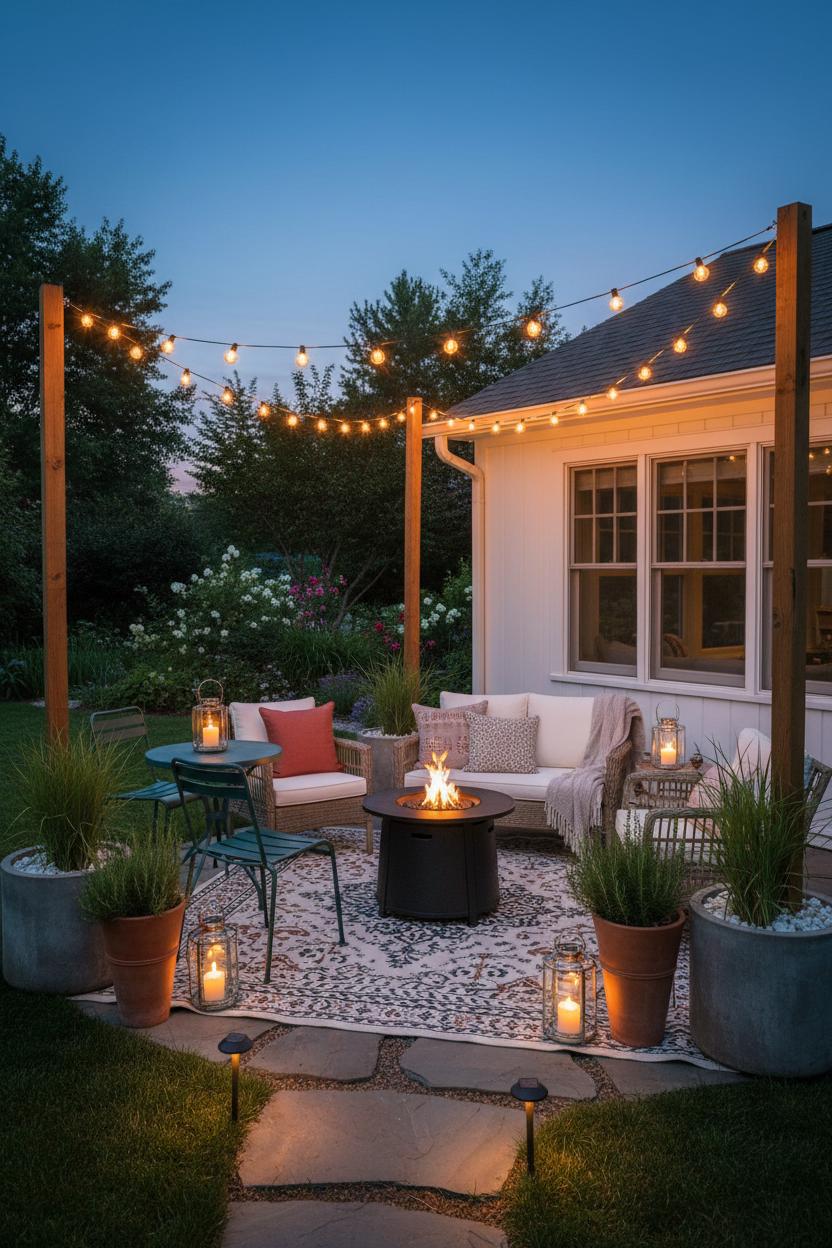 Once the twinkle is sorted, layer in cozy patio decor to make the glow work harder. Anchor your outdoor seating with a patterned outdoor rug to visually define the hangout zone, then mix in rattan patio furniture for texture and easy-breezy vibes. A compact fire pit becomes the flickering heart of the evening, while a few tall planters brimming with herbs or feathery grasses create soft edges and a whisper of privacy. Add throw pillows and a light blanket or two, stash citronella candles in lanterns, and consider a few solar stake lights to guide the way. These simple back porch ideas stretch a small footprint, and they’re kind to your wallet: thrift a café table, spray-paint mismatched chairs one cohesive color, and let the lights tie everything together. Whether you’re styling a petite balcony or refreshing a full porch, this glow-first strategy turns even the tiniest corner into a swoon-worthy retreat—proof that the right strand of outdoor string lights can elevate small patio ideas into big-time charm.