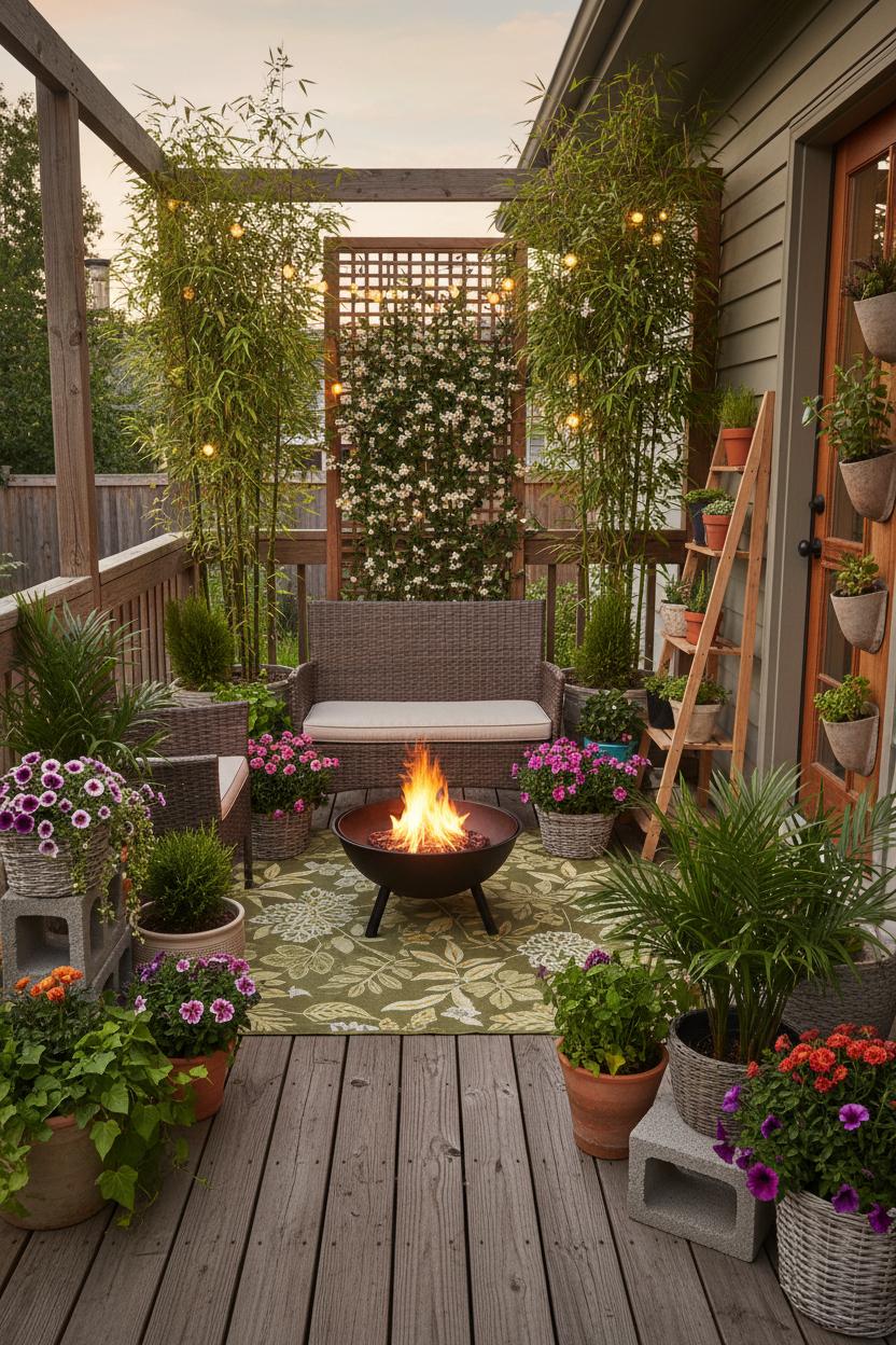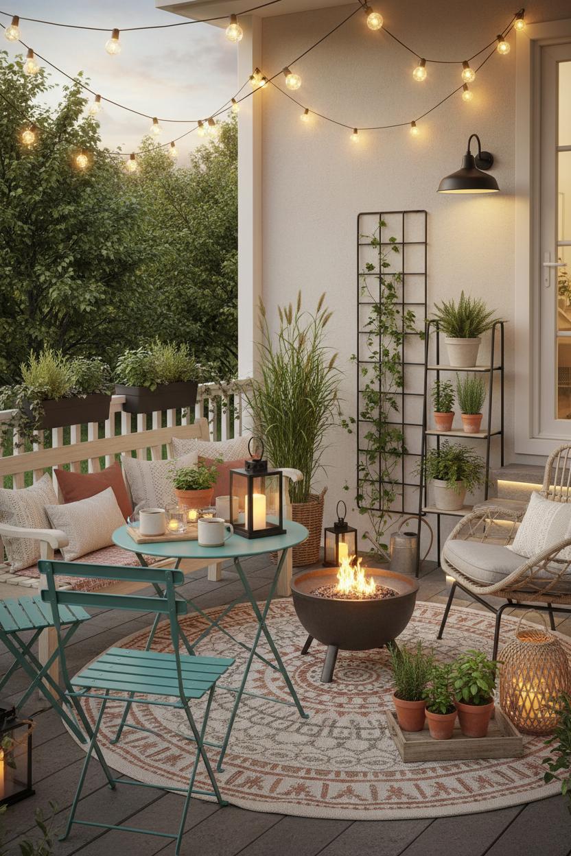 Finally, bring it to life with greenery. Group planters in varied heights—tall grasses for movement, trailing ivy for softness, and an herb trio near your seating for pinch-and-sip moments. For small patio ideas, tuck rail planters along the banister, use a tiered plant stand, or train a vine up a slim trellis to pull the eye upward. A compact fire pit, even a tabletop version, adds that flicker of campfire coziness on cool evenings and doubles as a visual anchor. Sprinkle in a few decorative touches—patterned cushions, a woven tray, a pretty watering can—and your budget patio is officially guest-ready. Simple, layered, and glow-y: the kind of space that makes you want to pour another glass and stay awhile.