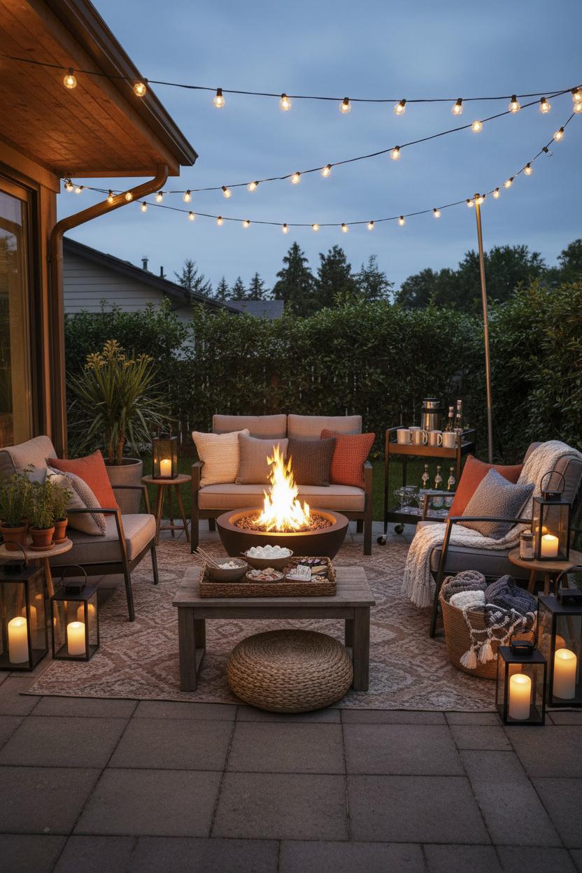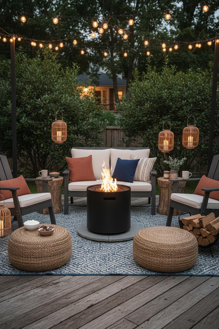 Imagine inviting friends to sink into plush chairs as twilight settles, the centerpiece of your gathering glowing softly: a smokeless fire pit that gives you all the flicker and none of the fuss. Arrange your outdoor seating in a relaxed semicircle so everyone can see each other and warm their toes—perfect for a small backyard where flow matters. Ground the zone with an outdoor rug to visually “room” the space, then pile on weatherproof cushions in layered textures for that instant-lounge feel. Sprinkle patio lanterns at different heights—on side tables, tucked near planters, and lining the edge of the patio—so the whole area hums with warm, candle-like light. For easy, high-impact patio lighting, drape string lights outdoor from the eaves or fence to a freestanding pole, making a soft canopy over the conversation zone; choose amber or warm white bulbs to flatter faces and make snacks look irresistibly styled.