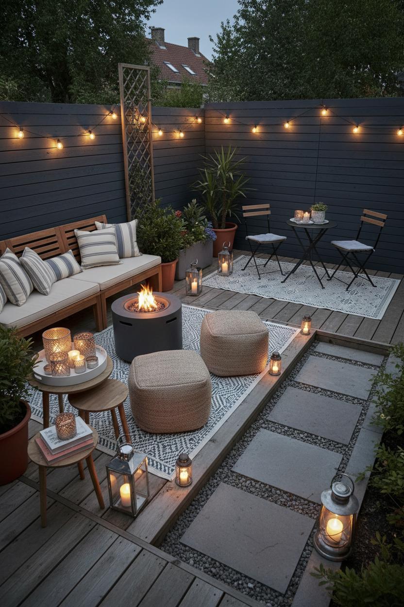 When you’re working with a small backyard, the smartest cozy backyard ideas start with breaking the space into flexible “mini rooms” that can shift with your plans. Think of one corner as a lounge, another as a quick-dining perch, and the path between as your easy flow line so you’re not weaving around chairs with a tray in hand. Anchor each zone with an outdoor rug to visually define it without building anything permanent; a flat-weave style keeps things low profile and easy to shake out. Perimeter seating is your space-saving hero—an L-shaped bench along a fence, topped with weatherproof cushions, creates instant outdoor seating without cluttering the middle. Pair it with a couple of lightweight side tables or nesting stools that can slide around as needed. Setting furniture on a soft diagonal also tricks the eye into seeing more room than you have, and a slim, foldable bistro set can pop up for morning coffee, then tuck away for larger gatherings.