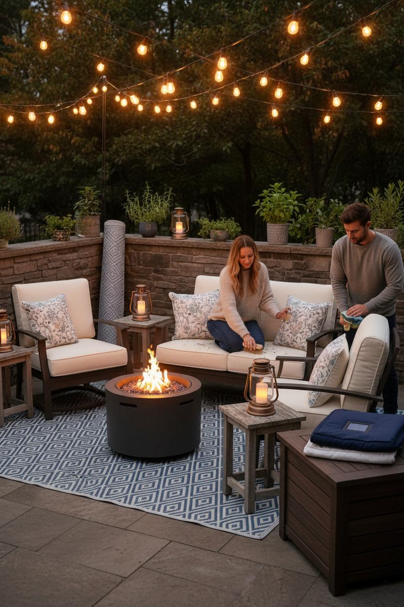 When you’re building a backyard you can love in every season, a little care routine goes a long way—especially for weatherproof cushions, patio lanterns, and that hardworking outdoor rug that defines your outdoor seating zone. Start with cushions: give them a quick weekly shake and soft-bristle brush to lift pollen and crumbs, then spot-clean with mild soap and lukewarm water. Let them air-dry standing on edge so moisture escapes, and reapply fabric protectant at the start of spring to help repel UV and showers. On blustery days, tie down cushions or stash them in a deck box; even weatherproof cushions appreciate a break from heavy storms. If you’re cozying up near a fire pit, keep a safe buffer so sparks don’t kiss the fabric, and choose a smokeless fire pit if you want that campfire glow without the lingering scent. One of my favorite cozy backyard ideas is swapping in a second set of slipcovers mid-season to keep everything looking fresh without a full deep clean.