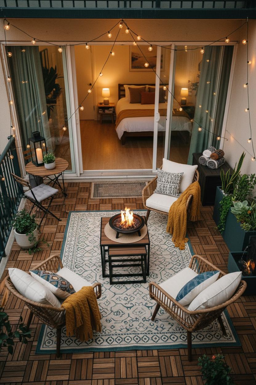 When the sun dips, lighting turns everything cinematic. Hang string lights outdoor along a fence line or zigzag them overhead; those warm-white outdoor string lights cast the kind of glow that flatters both people and plants. Tuck a lantern near the chairs for layered light and keep a small side table handy for mugs and spritzes. If you love fire pit seating but don’t have room for a built-in, a portable fire pit is your flexible friend—pull it out for s’mores nights, then tuck it away when you want more floor space. The rattan’s honeyed tones feel extra cozy against flickering flames, and the woven texture won’t visually weigh down the area. To finish, add a tray with citronella and a tiny herb pot, and consider a compact storage basket for blankets so the nook stays tidy. Rattan patio chairs + a grounding rug + warm glow equals an instant retreat, proof that small tweaks—especially with small patio decor—can transform a corner into the comfiest seat in the house, no renovation required.