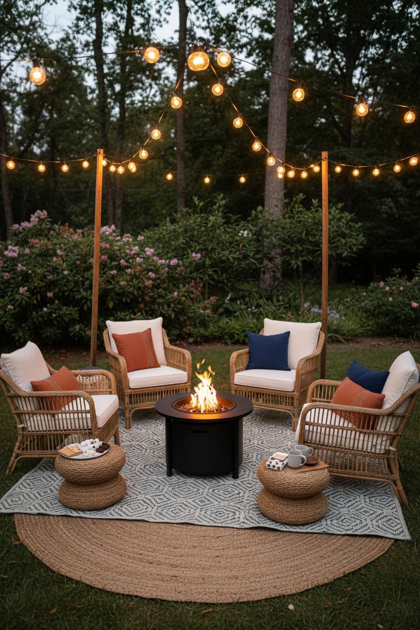 When you want that campfire-meets-living-room vibe, a circular arrangement around the flame is the instant classic. Place a compact, portable fire pit at the center, then circle it with rattan patio chairs and a couple of low stools so everyone has a prime view of the sparks. An outdoor rug (or two layered for texture) anchors the scene and keeps it feeling intentional, while weatherproof outdoor cushions soften the seats and invite lingering. For safety and comfort, leave at least three feet between the fire and your chairs. To amplify the glow, drape outdoor string lights overhead so they radiate out like a cozy halo—this is one of those cozy backyard ideas that always photographs beautifully and works on almost any budget. It’s simple, friendly fire pit seating that whispers: stay awhile.