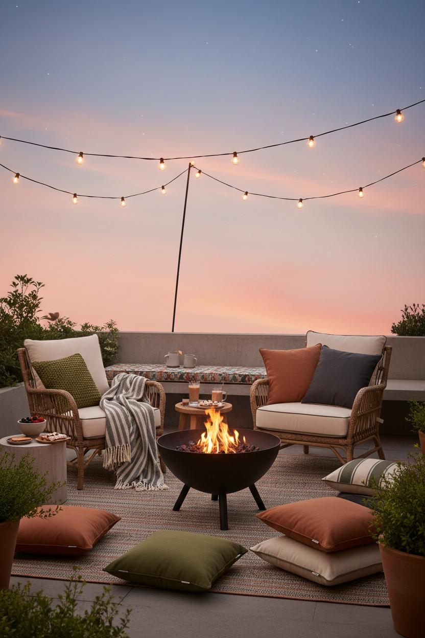 To make the most of fire pit seating in petite layouts, think low-profile and movable. A set of rattan patio chairs with slim arms, weatherproof outdoor cushions, and a soft throw creates that loungey glow without crowding the footprint. Nesting stools double as side tables for mugs and s’mores kits, and a neutral outdoor rug frames the gathering spot so the pit feels intentional, not squeezed. Overhead, drape string lights outdoor for sparkle; mixing globe outdoor string lights with a dimmer gives you two levels of glow—twinkle above, flame below—so the space reads warm, not bright. Keep your palette cohesive and your silhouettes airy, and your small patio decor will feel elevated, not cluttered.
