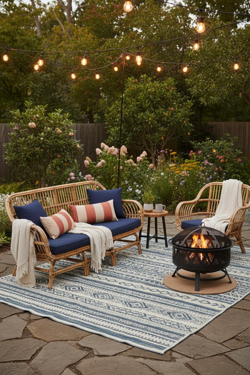 Match size to furniture, not the other way around. Two rattan patio chairs with a petite side table shine on a 4×6 rectangle or a 5-foot round; for a loveseat plus two chairs, scale up to a 6×9 so all front legs sit comfortably on the rug. If you’re planning fire pit seating, choose a rug that extends at least 12 inches beyond the back legs of your chairs to keep them stable as you scoot in and out. With a portable fire pit, never place an outdoor rug directly under open flame—position the pit on nonflammable surface or use a fire-resistant base, and float the rug just outside the heat zone to define the perimeter beautifully. For layered, cozy backyard ideas, try a flatweave base with a soft throw over the chair backs; weatherproof outdoor cushions add color and comfort without fuss.