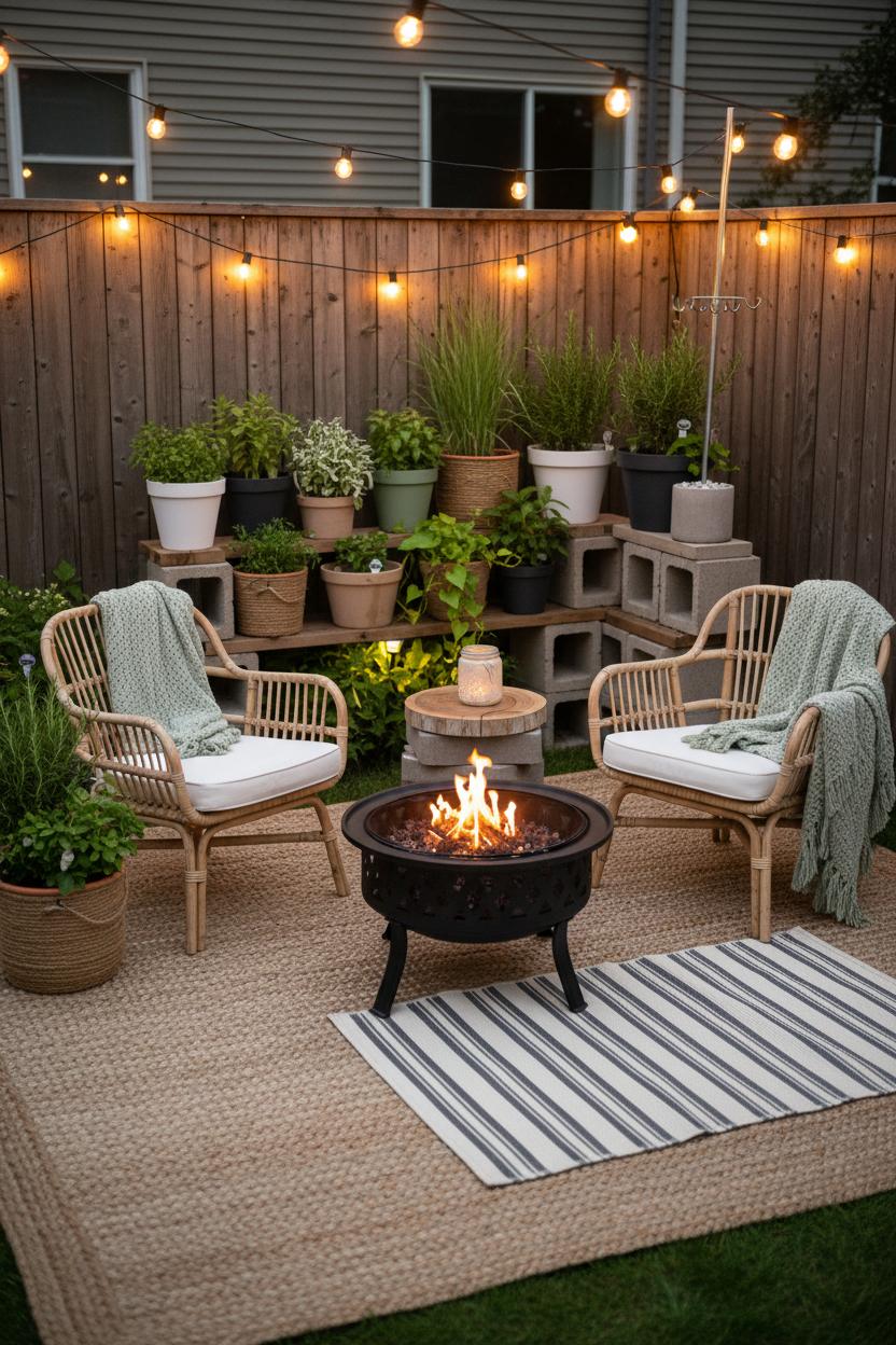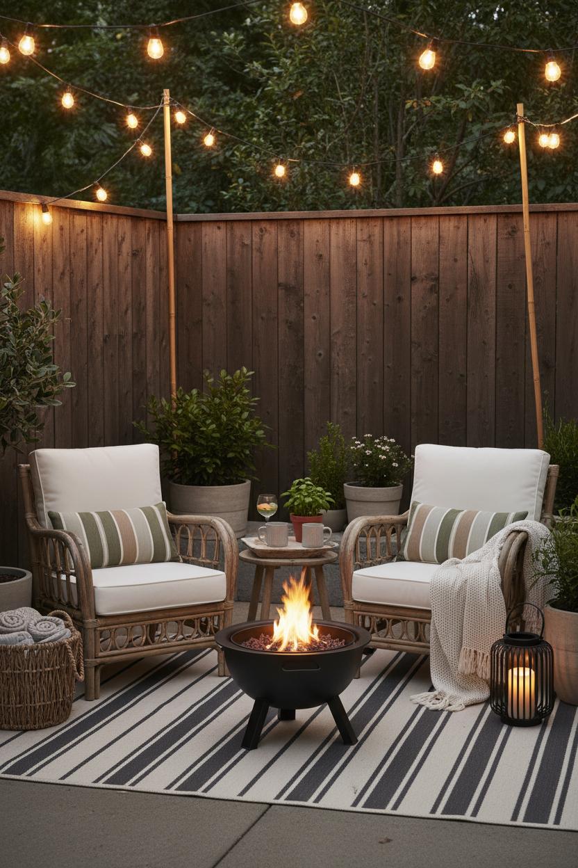 Now create nooks that invite lounging. Anchor each perch with an outdoor rug—patterned outdoor rugs visually “room” the space and coax bare feet to stay awhile. A single outdoor rug beneath rattan patio chairs instantly reads as a conversation zone; add a tiny bistro table for mugs and candlelight. If you’re planning fire pit seating, try a semicircle of low-slung chairs layered with lumbar pillows and a couple of poufs to pull up as needed. On truly compact patios, scale down with nesting side tables and folding stools, and lean into vertical touches like wall-mounted planters or a slim console for lanterns and extra blankets. Mix textures—woven rattan, slubby cotton, matte metal—and keep your palette warm and sun-kissed so the whole setup feels cohesive even in tight quarters. The magic is in the details: a sprig of rosemary in a bud vase on the table, a tray for s’mores fixings by the portable fire pit, dimmable bulbs on your string lights, and a stack of weatherproof outdoor cushions ready for impromptu floor seating. With layered light and thoughtfully defined nooks, even the tiniest backyard transforms into a glow-soaked retreat you’ll never want to leave.