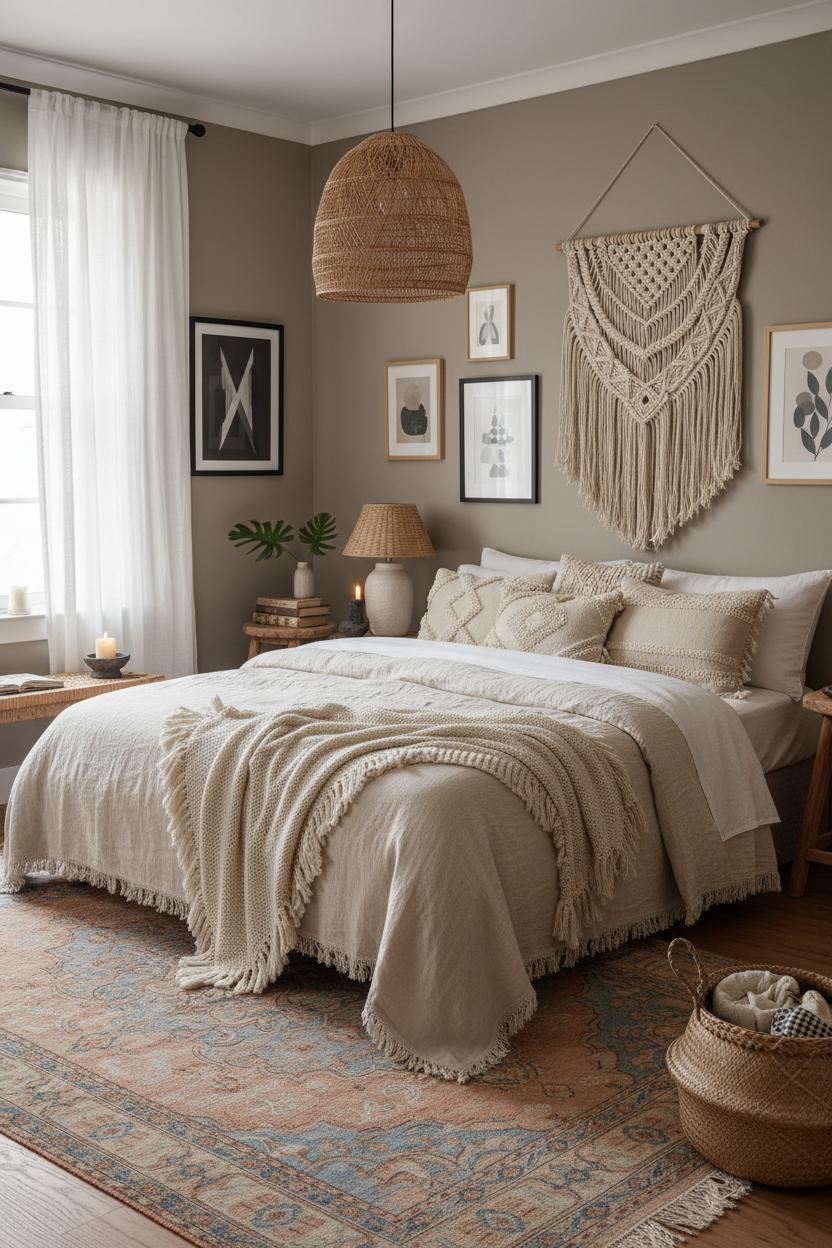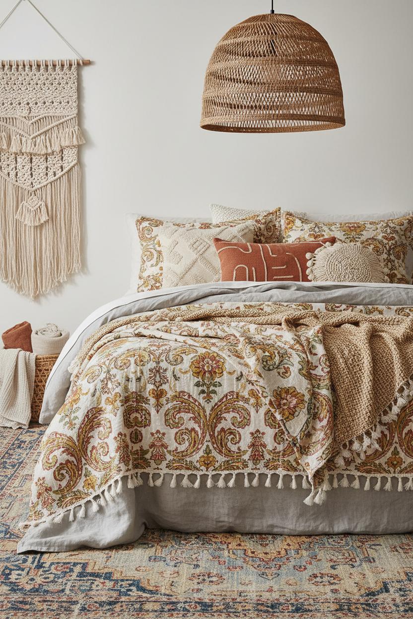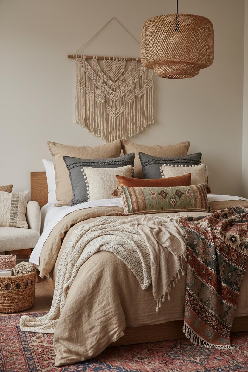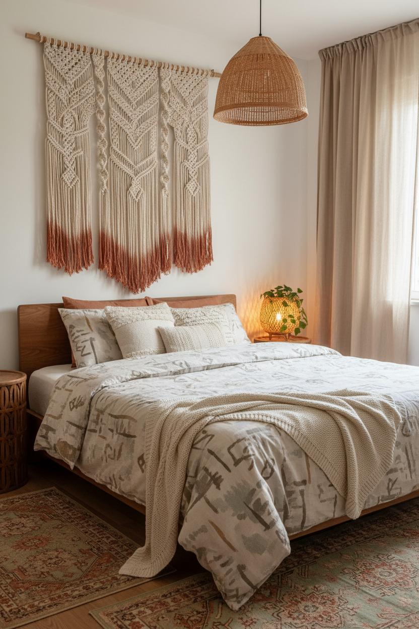 When working with pattern, think in scales: one bold motif, one medium print, and one subtle texture keeps everything balanced. If you love a neutral bedroom, texture does the heavy lifting—oatmeal linens, sand-toned quilts, and clay or sage accents let you stay calm and grounded without feeling flat. Layer in textured throw pillows with a mix of embroidery, tufting, and stitched details to bridge your quilt and duvet. Ground the whole scene with a vintage rug for that collected-over-time vibe, and bring in natural warmth overhead with a rattan pendant light that casts a gentle glow across the bed’s nubby surfaces. A macrame wall hanging adds a soft, vertical counterpoint to the horizontal layers on your bed, echoing the fiber story and making the room feel intentionally cohesive.