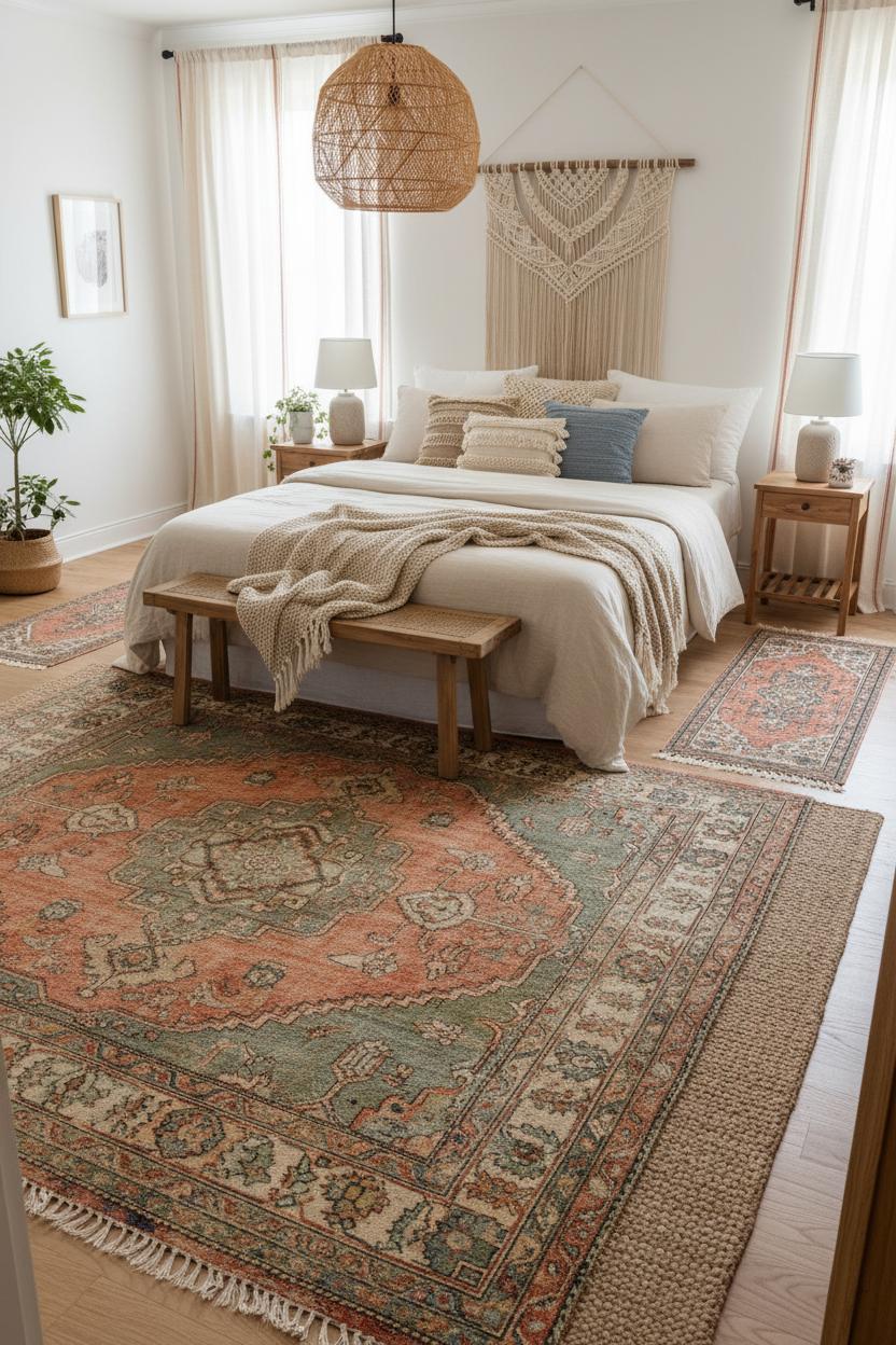 A vintage rug is the secret sauce that makes a cozy boho bedroom feel instantly grounded and intentional. Lay one down and the whole space softens: the colors whisper rather than shout, the worn-in pattern adds a lived-in story, and your feet get that cushy, morning-warm welcome. In a neutral bedroom, a timeworn vintage rug brings depth without overwhelming—think sun-faded terracotta, muted indigo, or smoky olive that echo the tones in your boho duvet cover and textured throw pillows. If your bed is the star, the rug is the stage: size up so the rug extends at least 18–24 inches beyond the sides of the bed, or layer a smaller vintage rug over a natural jute for that perfectly imperfect, layered textiles moment. A slim runner on either side of the bed is a great trick in tighter rooms, and don’t forget a rug pad so everything feels plush and stays put.