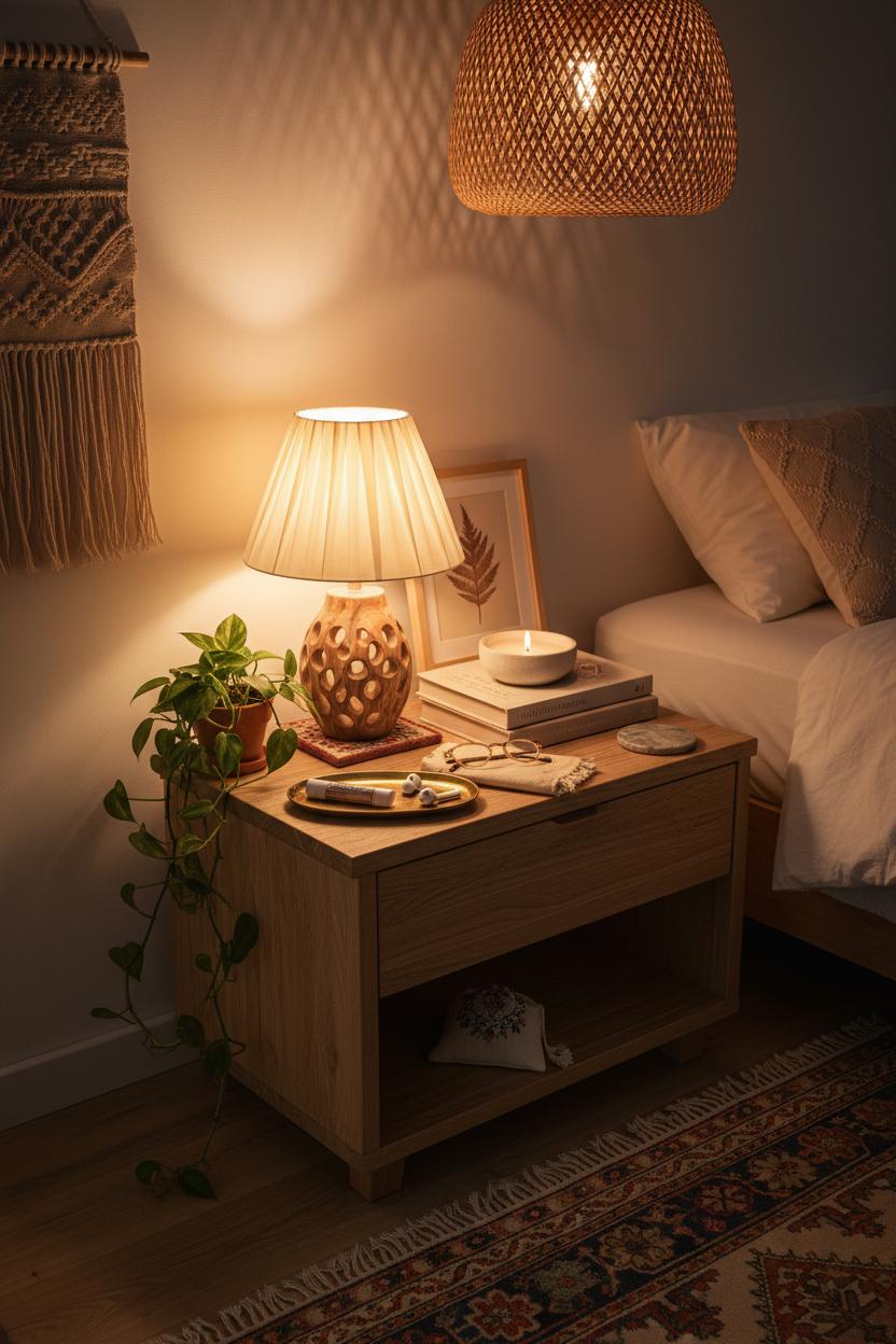 Next comes the book moment. Stack a few favorites horizontally to create a platform for a ceramic dish or candle, and keep a current read on top so it feels intentional, not fussy. Mix matte and glossy covers or flip spines inward for a softer palette; either way, let the titles you love be the decor. For greenery, a trailing pothos or heartleaf philodendron brings gentle movement; if you’re low-light or low-maintenance, dried eucalyptus in a bud vase still gives that organic silhouette and a whisper of scent. Corral small things—lip balm, matches, earbuds—on a stone or brass tray, add a coaster for nighttime tea, and tuck a linen sachet in the drawer. If your vintage rug peeks out beside the bed, let its tones inspire the whole vignette so everything feels collected. Keep cords discreet, leave breathing room on the surface, and you’ll have a nightstand that looks layered but lives easy—an effortless blend of bohemian decor and hygge style that turns lights-out into a ritual. Bonus: when the lamp clicks off, the glow from the rattan pendant light and the texture of your macrame wall hanging carry the mood across the room.