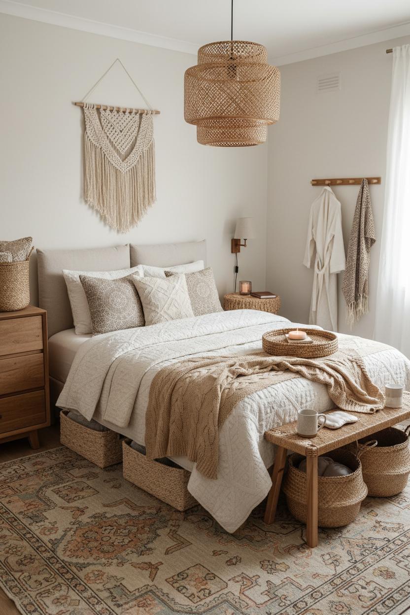 In a small space, the secret to a cozy boho bedroom is letting texture do the talking while your storage quietly works behind the scenes. Start with a “textile capsule” in a soothing palette—think oat, sand, and cream with a whisper of clay—to keep that neutral bedroom calm. Layered textiles are your best friend, but give them a plan: one vintage rug to ground the room, a breathable boho duvet cover as the base, a lightweight coverlet for daily use, and a single chunky throw at the foot of the bed. Keep patterns in the same family so the eye reads harmony instead of clutter, then add a few textured throw pillows for dimension you can edit seasonally. A rattan pendant light pulls the gaze up and frees nightstand space, and a macrame wall hanging brings softness without eating floor area—bohemian decor that floats is gold in tight quarters.