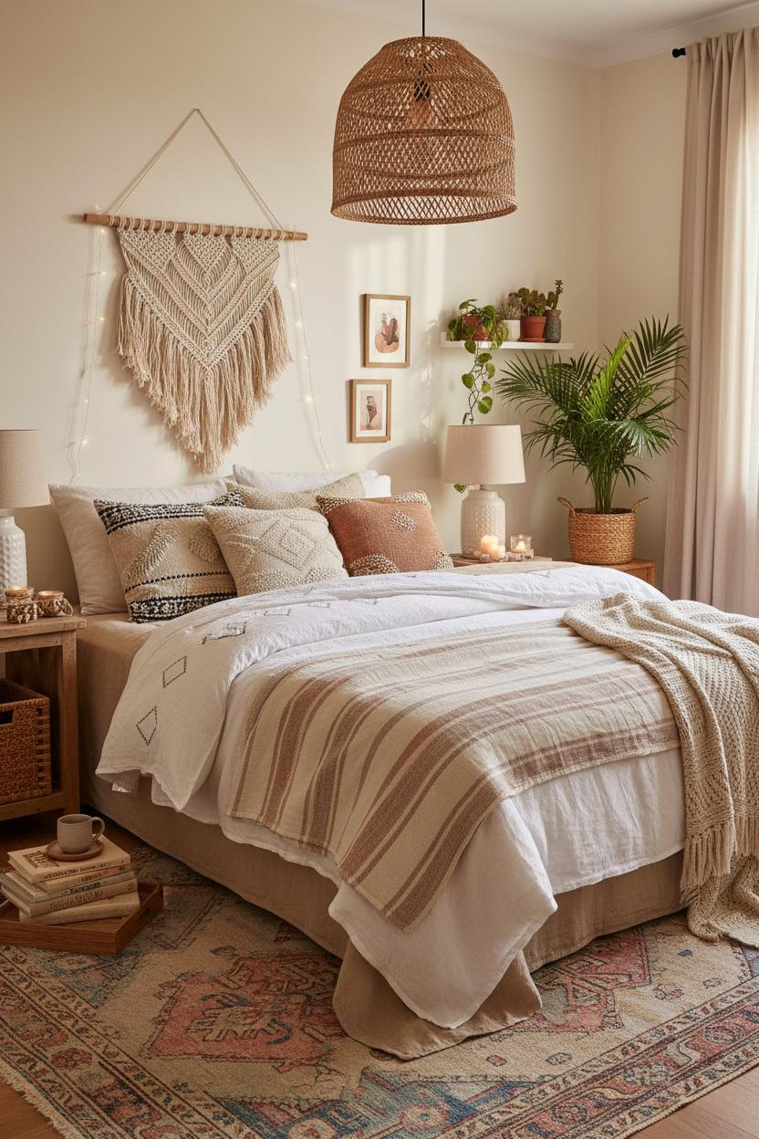 Blankets are where the magic really happens. Toss a chunky knit across the foot of the bed, fold a light gauzy throw on top, and drape a patterned Turkish blanket diagonally for movement. The interplay of thick and thin, matte and slightly lustrous, creates that dimensional, sink-in feel you see on Pinterest. If your room leans minimalist, textures will keep it interesting without overwhelming your palette; if you love pattern, balance a bold printed throw with solid, slubby pillows so the eye can rest. Scatter a few textured throw pillows on a chair or bench, let a vintage rug peek out from under the bed for global character, and tie it all together with soft, ambient light from a rattan pendant light. A macrame wall hanging above the headboard adds gentle rhythm and rounds out the layered look. Practical tip: choose washable covers and keep an oversized basket nearby for easy rotation. The result is a bed that begs you to linger—an inviting nest of layered textiles that feels curated, personal, and endlessly cozy, the heart of your bohemian decor haven.