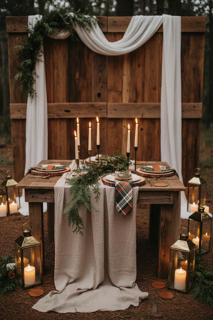 To make it personal, mix in family heirlooms that tell your story. Prop black-and-white wedding portraits of grandparents in weathered frames, lay a vintage compass or pocket watch on a charger, or tuck a small lace handkerchief between the cedar sprigs. If you have a beloved camp mug or an heirloom candlestick, let it join the vignette; the contrast of gleaming brass lanterns with timeworn treasures is the definition of rustic wedding ideas done right. A subtle hit of pattern goes a long way too—tie scraps cut from plaid napkins around lantern handles or the base of a taper candle holder for a wink of mountain wedding charm without overwhelming the palette. Keep colors earthy and cohesive, then add tiny foraged touches—pinecones, feathers, or a single stem of seasonal bloom—to bridge the line from indoors to the surrounding pines.